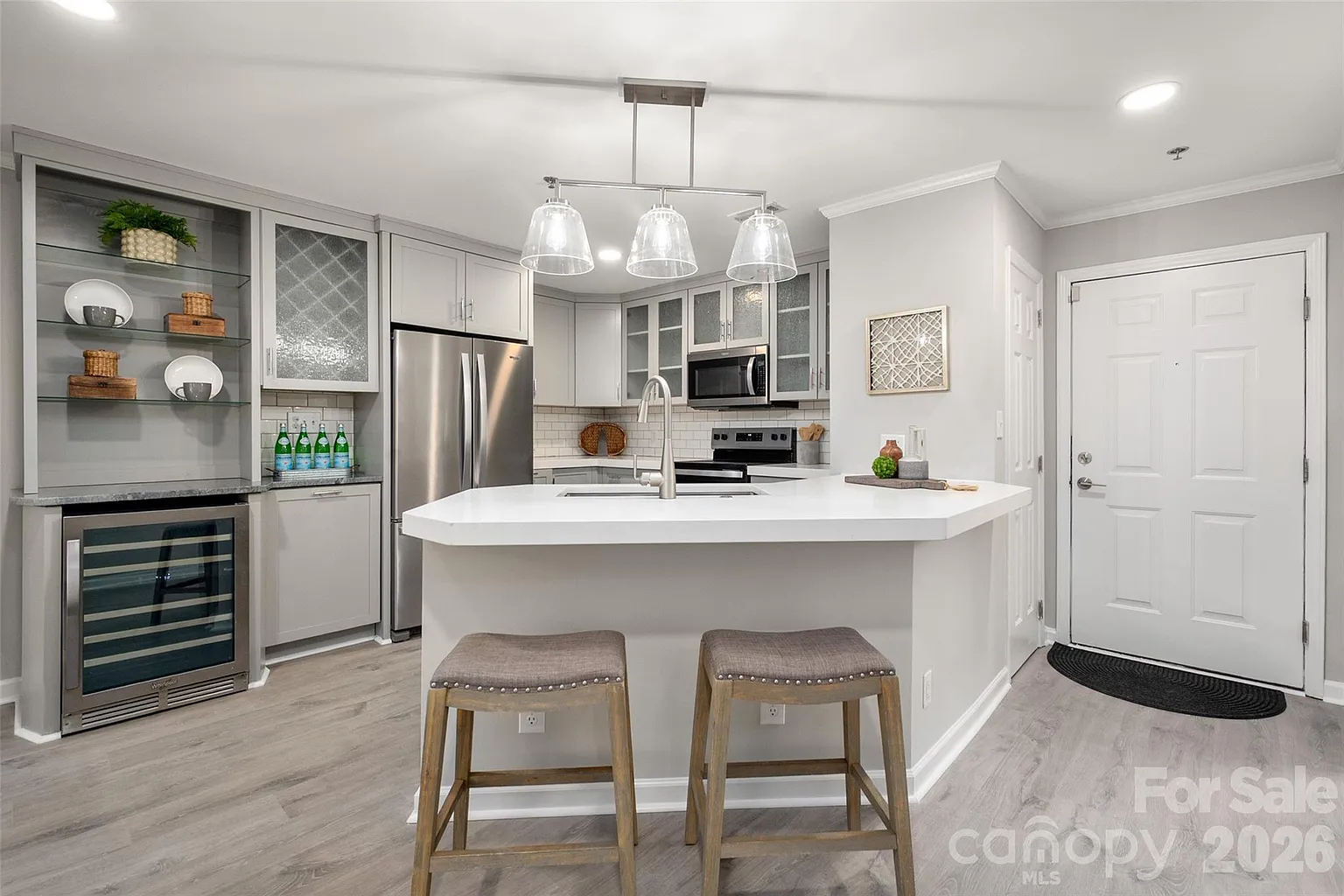 *Renovated Uptown condo with rare covered parking beside the entrance. *Stylish kitchen with dedicated wine bar and open living space designed for entertaining. *Located in the heart of historic Fourth Ward with quick access to parks, stadiums, restaurants, and light rail. Updated 2-bedroom, 2.5-bath condo in Fourth Ward Square located in Uptown Charlotte’s historic Fourth Ward. Enjoy convenient access to Romare Bearden Park, Truist Field, Bank of America Stadium, Spectrum Center, the LYNX light rail, and many of Charlotte’s best restaurants, museums, and nightlife. Bright, open interior with LVP flooring throughout and a thoughtfully designed kitchen featuring quartz countertops, subway tile backsplash, stainless steel appliances, rain glass upper cabinets, and a dedicated wine cooler with glass display shelving - perfect for entertaining! The primary suite includes a spa-like bath with floor-to-ceiling subway tile shower, glass enclosure, and built-in niche. The secondary bedroom offers its own ensuite bath with subway tile surround, built-in niche with accent tile, and tub for relaxing. A separate powder room with vessel sink adds convenience for guests. Private patio provides a great space to unwind or enjoy morning coffee. Two covered parking spaces located directly beside the entrance make Uptown living easy. Fourth Ward Square amenities include a pool, fitness center, grilling areas, clubhouse, mini dog park, and pet stations throughout the community. Google Fiber available.