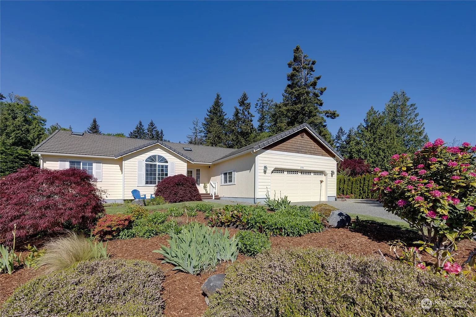 Welcome to your slice of sunshine in Port Ludlow. Charming one level rambler with 3 bedrooms and 1.75 bath. Light and bright with great flow, this home provides easy living. High ceilings in the living and kitchen make the home feel spacious. Cheerful layout connects the eat-in kitchen to living room and the propane stove provides quick coziness. Stay comfortable in the summer with AC. Gaze upon the low maintenance Zen garden from the porch which is accessed through the kitchen. Primary suite has ensuite and walk in closet. Two additional rooms provide flexible office/guest space. Beach Club (HOA) amenities include indoor/outdoor pools, tennis/pickle ball courts, beach access and more!