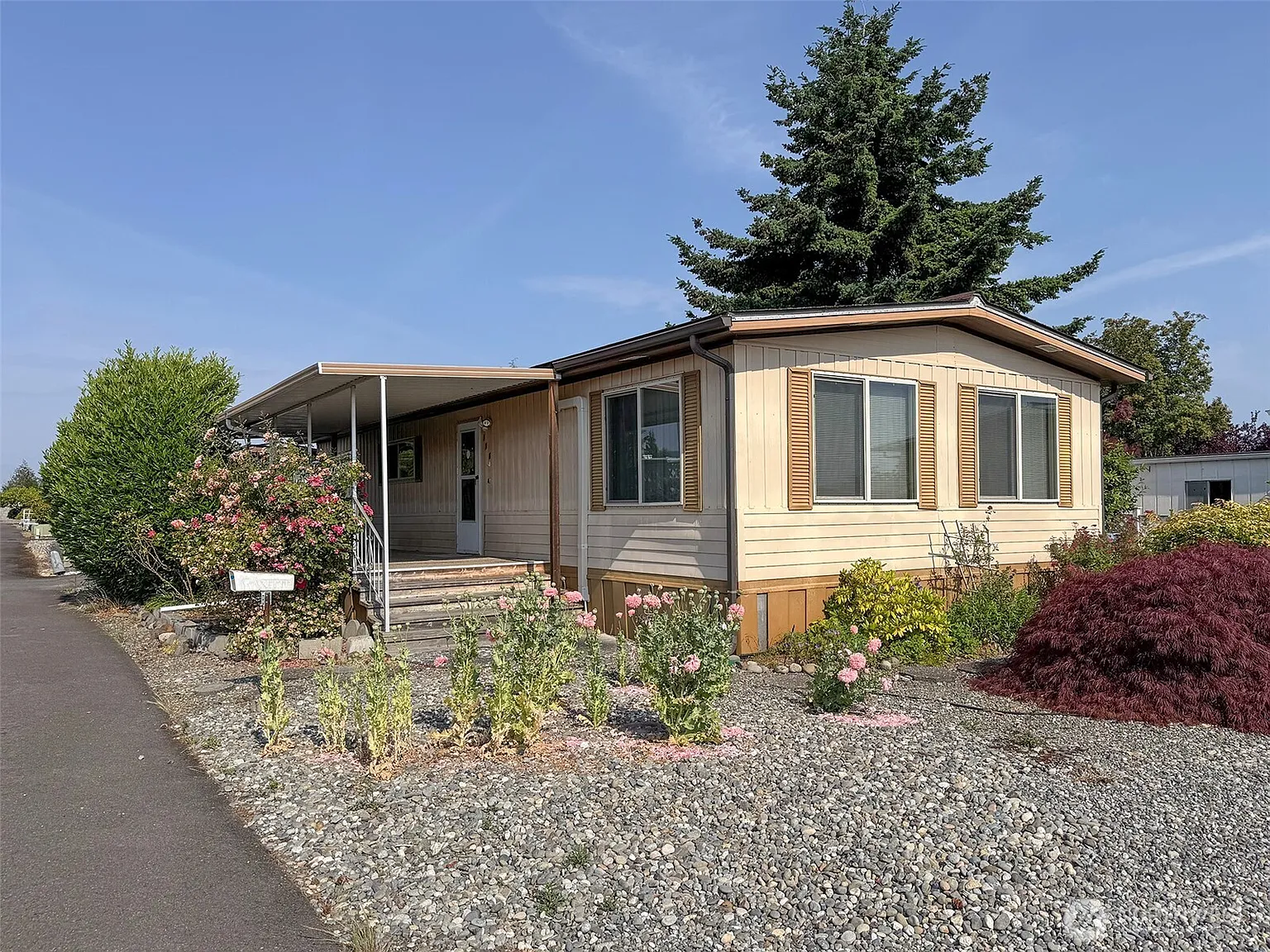 DOWN SIZING? This 960 SF home with 2 BR & 1 1/2 BA is located in an age 55+ park within Sequim’s city limits. Easy care yard on a corner lot. Space rent is only $650 - includes water, sewer, garbage. Home features newer countertops, double pane vinyl windows, 2 one-year-old ductless heat pumps for energy efficiency & air conditioning, all appliances stay including a brand new range, utility area off kitchen, covered front porch, carport with storage shed. Great location - located behind Safeway grocery store, close to shopping, medical facilities, restaurants, & public transportation. Park approval is required - indoor pets are allowed, no dogs. Enjoy the easy life in this home in sunny Sequim just waiting for a new owner.