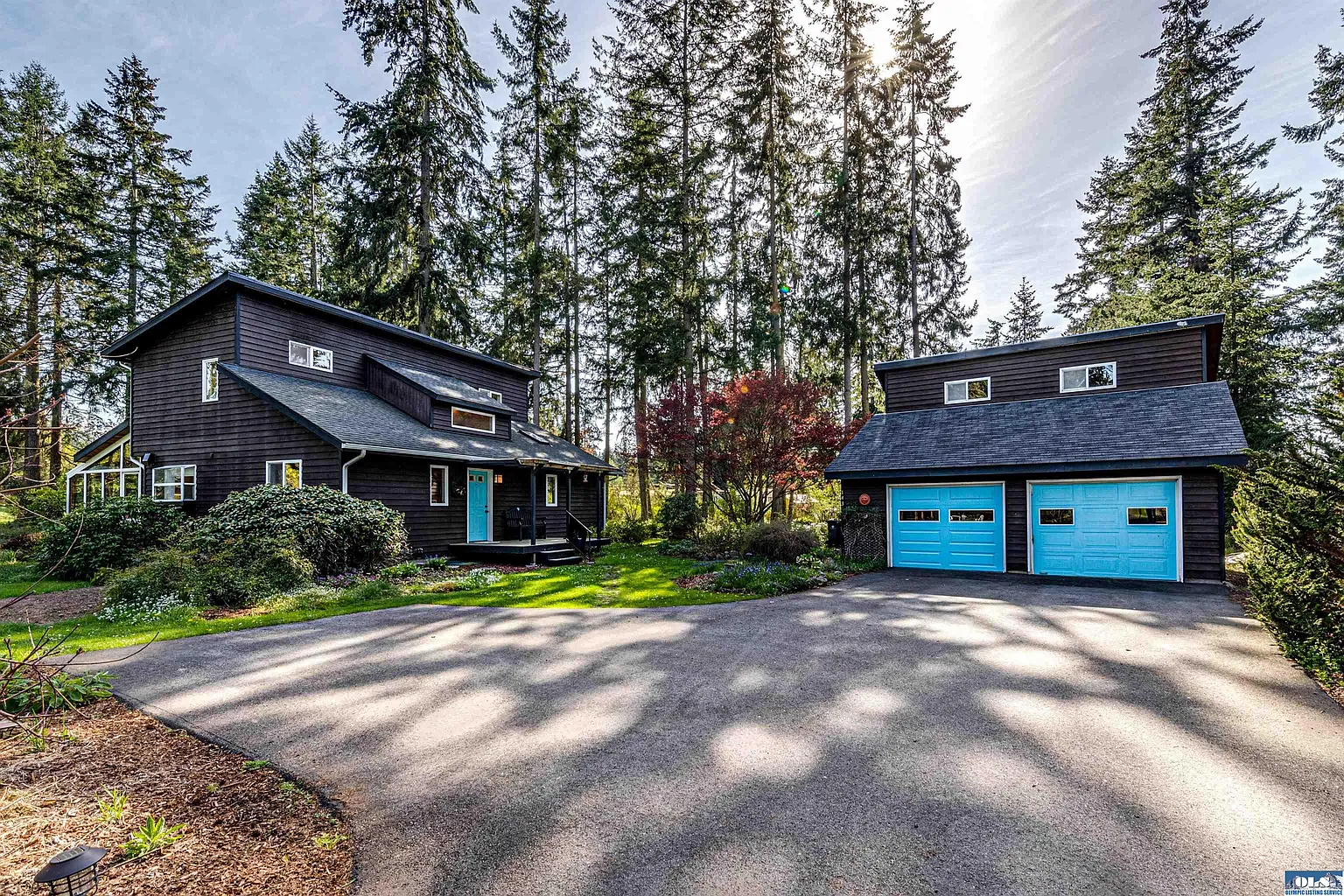 AT HOME IN THE WOODS! This property is tucked into mature trees, but conveniently located just south of town! Appealing quartz-countered kitchen, sunny south-facing sunroom and bedroom on main level. Two additional bedrooms and full bath upstairs. Detached 2 car garage includes laundry area, is plumbed for a future half bath, has an upper level for future finish and potting shed off the back! Access to irrigation serves the attractive landscaping, yard and fenced vegetable garden! This one is a cutie!