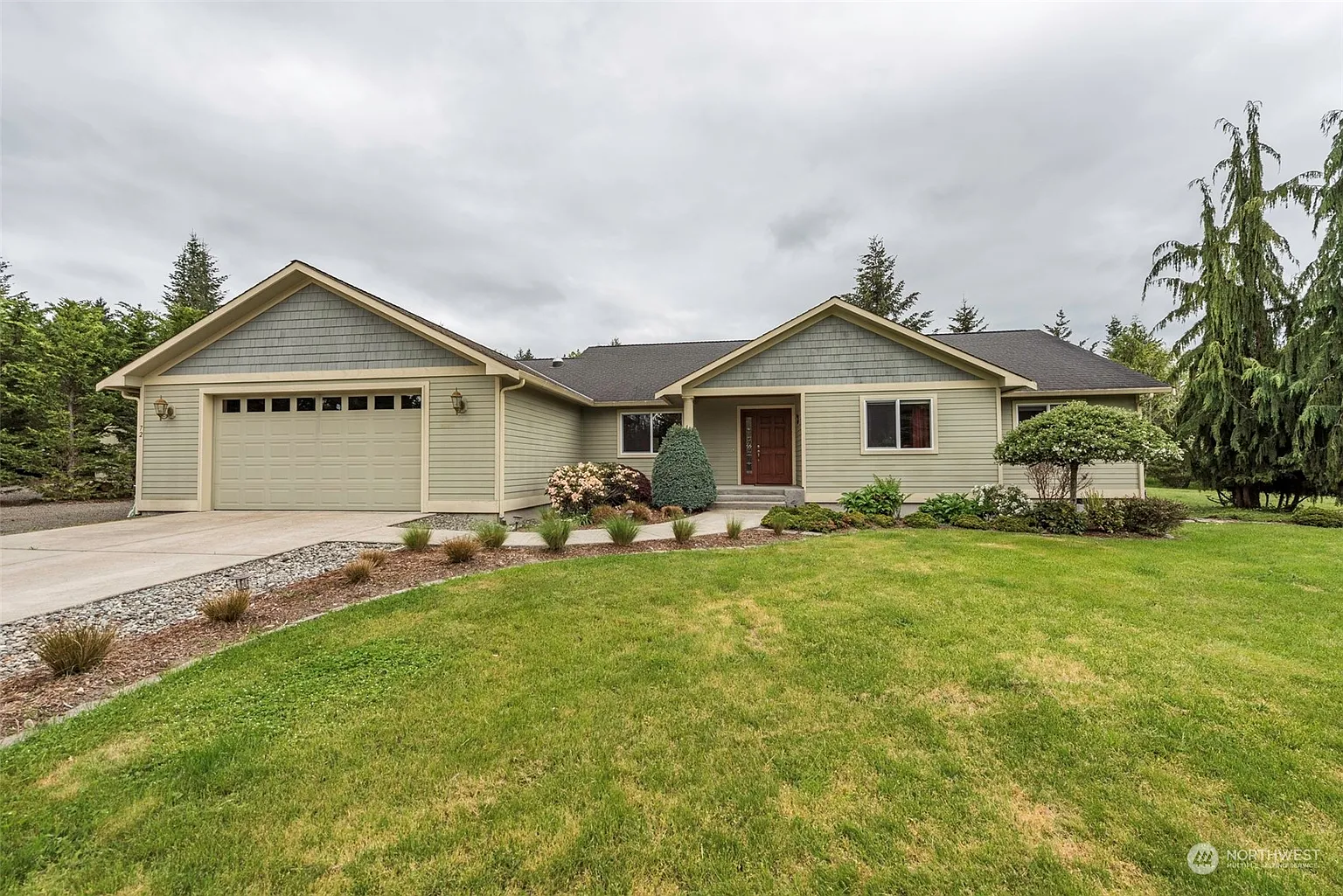 Welcome to this beautifully maintained 2,130 sqft rambler- nestled on an expansive acre lot, offering both space and serenity. The spacious kitchen is a chef's dream, featuring granite countertops, ample cabinetry, a pantry, a built-in desk, and an eat-at peninsula. The primary bedroom is generously sized, complete with an attached five-piece bath and a walk-in closet. An additional bedroom, full bath, and a large utility room with a sink and extra storage cabinets provide convenience and functionality. Step outside to discover a deck and fire pit area, perfect for outdoor gatherings, with plenty of space to customize your yard to your liking. The attached three-car garage offers pull-through access, adding even more convenience.
