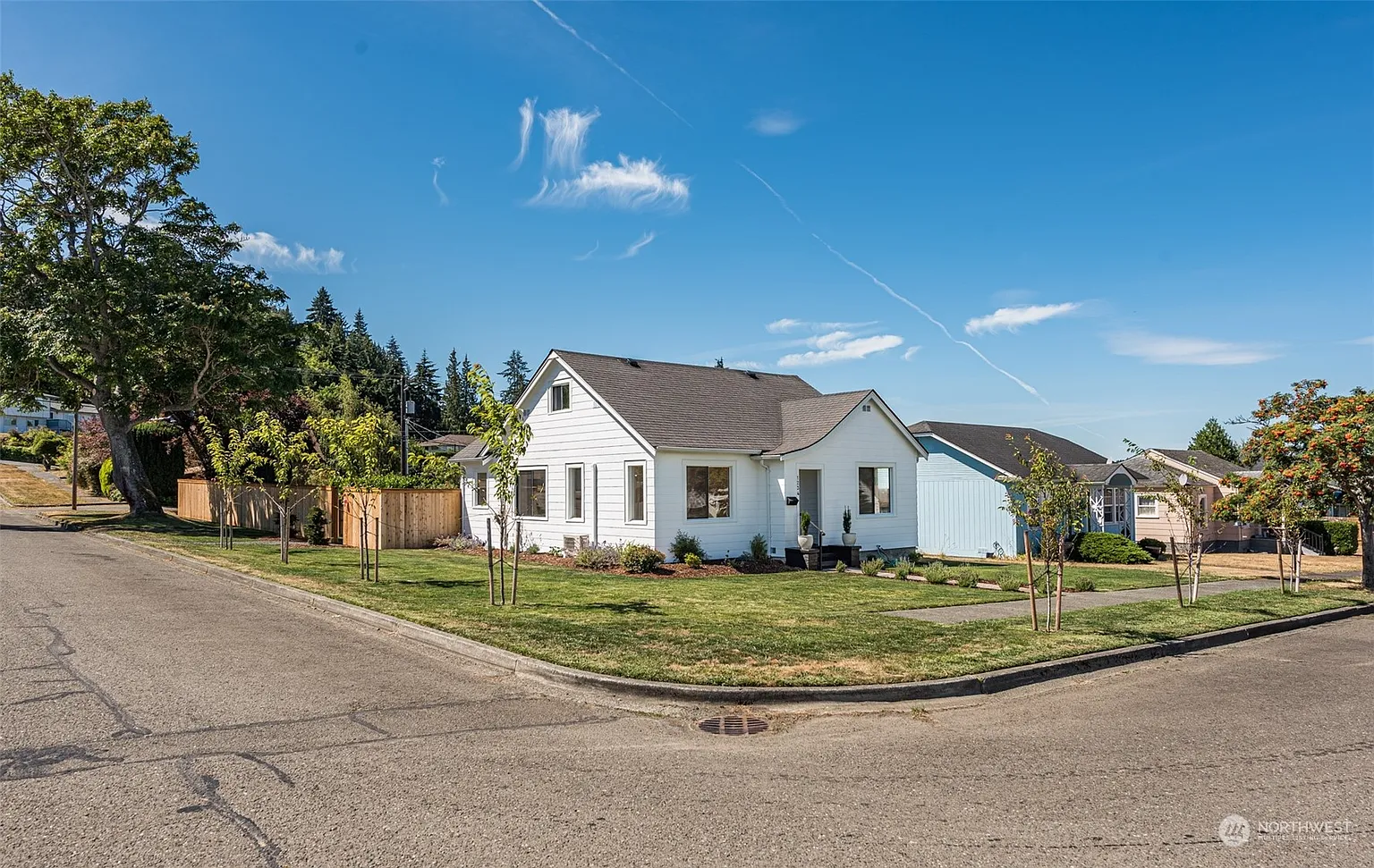 Set on a large corner lot, this circa 1935 storybook home has been renovated, marrying traditional aesthetic w/modern convenience. This charming cape style home offers open-concept living & an abundance of natural light throughout. Chef's kitchen, 2 bedrooms on main floor, w/upper level bedroom & extra bonus room. Ample built-in storage. A/C installed for warm NW summers. View from upper level! Fully fenced, private yard w/entertainment deck, outdoor shower & tub! Large lot has potential for an ADU/MIL, garage or both. Opportunity for long term tenants or airbnb income. Coveted, in-city location w/ EZ access to town, the Olympics, Victoria BC, & outdoor enthusiasts needs. Updated throughout w/designer finishes. Move-in ready. Welcome home!