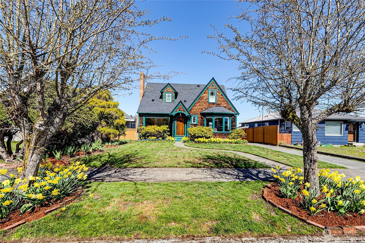 Cherry Hill Tudor filled with love and updates! Located in an iconic convenient location, you'll fall in love with the mountain views, enchanting curb appeal, cheerful landscaping, fenced backyard, detached garage, and also appreciate the newer roof, windows, composite deck, and heat pump. Inside features refinished hardwood floors, wood stove, remodeled kitchen with solid wood cabinetry, corion counters, stainless appliances, and coffee/office nook. Main level primary bedroom remodel with walk-in closet and en suite, with double vanity and custom tiled shower. Two bedrooms upstairs, plus bonus room. Fully finished basement with tons of living space, and even a wine cellar! This is the home you've been waiting for!