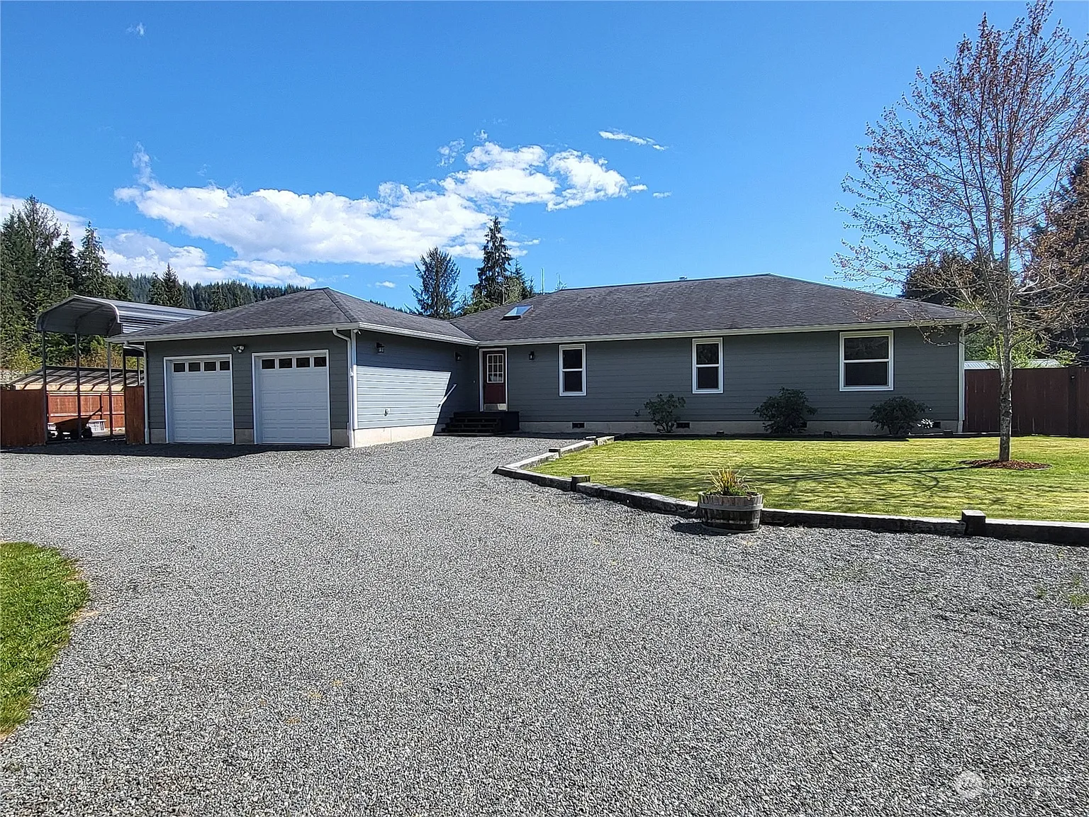 Move in and enjoy! 2009 single level home offers a great 1,950 sf layout with 3 bedrooms, an office and a bonus room. Stay comfortable with the free standing wood stove or by using the ductless heat pump in the open concept living area with White Oak floors. Beautiful kitchen has tile flooring, stainless appliances, quartz countertops and red oak cabinetry. Walk out of the adjacent dining room slider to a large partially covered deck in the fully fenced back yard. Primary bed offers a private bathroom, access to the office which features another slider and 2nd deck area. 2 car attached garage is complimented by a detached garage with woodstove, RV storage cover, and wood storage area. Amazing greenhouse as a great bonus!