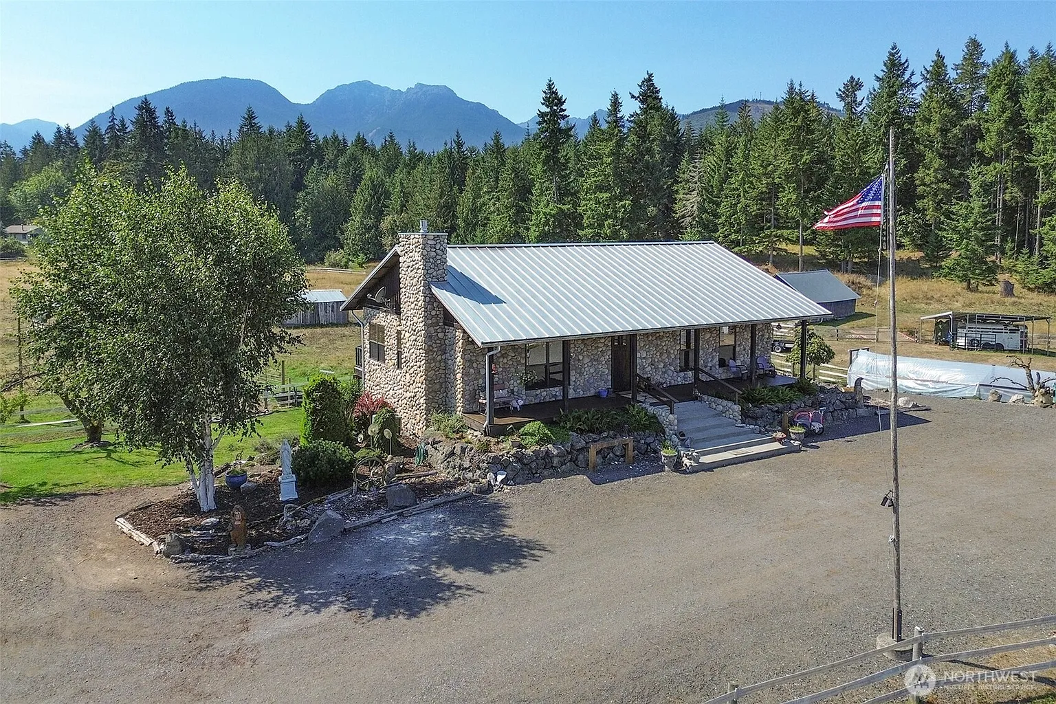 This distinguished country property offers a rare blend of refined living and authentic ranch heritage. Rolling pastures, wooded riding trails, seasonal ponds, and a year-round creek create a landscape that feels both curated and beautifully untamed. Designed for thoughtful land stewardship, the ranch features rotational grazing pastures with quality fencing, stock tanks, livestock shelters, and a creek-fed pond. Additional pastureland offers flexibility for future division, while the property has successfully supported both cattle and poultry. A larger seasonal pond and surrounding acreage attract abundant wildlife, from waterfowl to eagles. Approximately five wooded acres provide a private setting for riding, recreation, and foraging, rich with native plants and natural beauty. A historic 1940s barn, versatile shop, and converted garage spaces add function and charm, while numerous improvements—including upgraded access, outdoor living areas, garden space, and infrastructure—enhance everyday usability. Inside, the home features stone tile flooring, custom wood accents, and a beautifully appointed kitchen with Spanish tile and a KitchenAid gas range. The expanded primary suite includes a walk-in closet and ensuite bath. Originally a 3-bedroom, now a spacious 2-bedroom, the home also offers a lower level with private entrance—ideal for guests, multi-generational living, or flexible use.