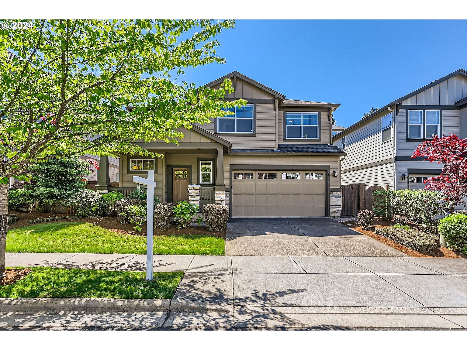 Located in desirable Twin Creeks on Cooper Mountain neighborhood, this charming Craftsman home boasts elegance and modern comforts. Built in 2015, its exterior exudes classic Craftsman appeal with a covered front porch adorned with tapered columns and a gabled roofline. The inviting foyer features engineered hardwood floors that flow seamlessly throughout the main level. The spacious living room is filled with abundant natural light filtering through large windows. Adjacent to the living room is the fabulous gourmet kitchen. The kitchen showcases luxurious granite countertops, complemented by sleek stainless steel appliances and custom cabinetry providing ample storage space. A breakfast bar offers additional seating and serves as a focal point for casual dining and social gatherings. Walk out from the dining area to a charming patio, extending the entertainment space outdoors and allowing for al fresco dining amidst the serene backdrop of the low-maintenance backyard. The spacious master suite is a private oasis, featuring plush carpeting, a walk-in closet, and a luxurious en-suite bathroom with a soaking tub, and a separate shower?a perfect retreat for relaxation and rejuvenation. Three additional bedrooms on the upper level offer flexibility for family members, guests, or home office space, each boasting ample closet space and large windows that bathe the rooms in natural light. A shared full bathroom with modern fixtures and a convenient laundry room complete the second level.