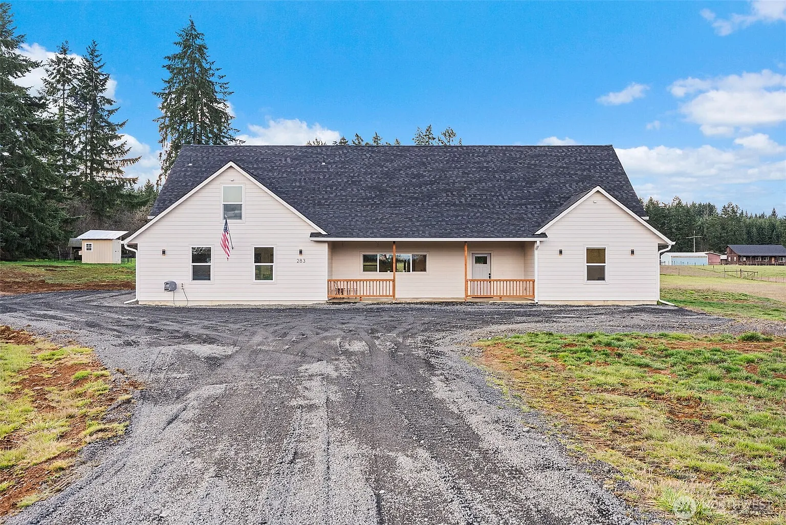 Like-new contemporary home built in 2023 on almost five usable, peaceful acres. This 4-bedroom, 2.5-bath home offers 9’ ceilings, abundant natural light, and an open, functional layout with all bedrooms on the main level—each featuring walk-in closets—plus a large bonus room upstairs. The spacious kitchen includes a large island, walk-in pantry, coffee bar, and stainless-steel appliances. The primary suite offers a generous walk-in closet and large tile shower. Additional features include a spare subpanel, two 50-gallon water heaters, large laundry room, attached 2-car garage, covered front porch, and an oversized covered back patio for year-round outdoor living. Huge bonus: approved ADU plans and permits on file plus a second well already installed. Open yet private setting with a newly built sauna—ready for its new owner with excellent future potential. Priced well below the original appraised value of $780,000.