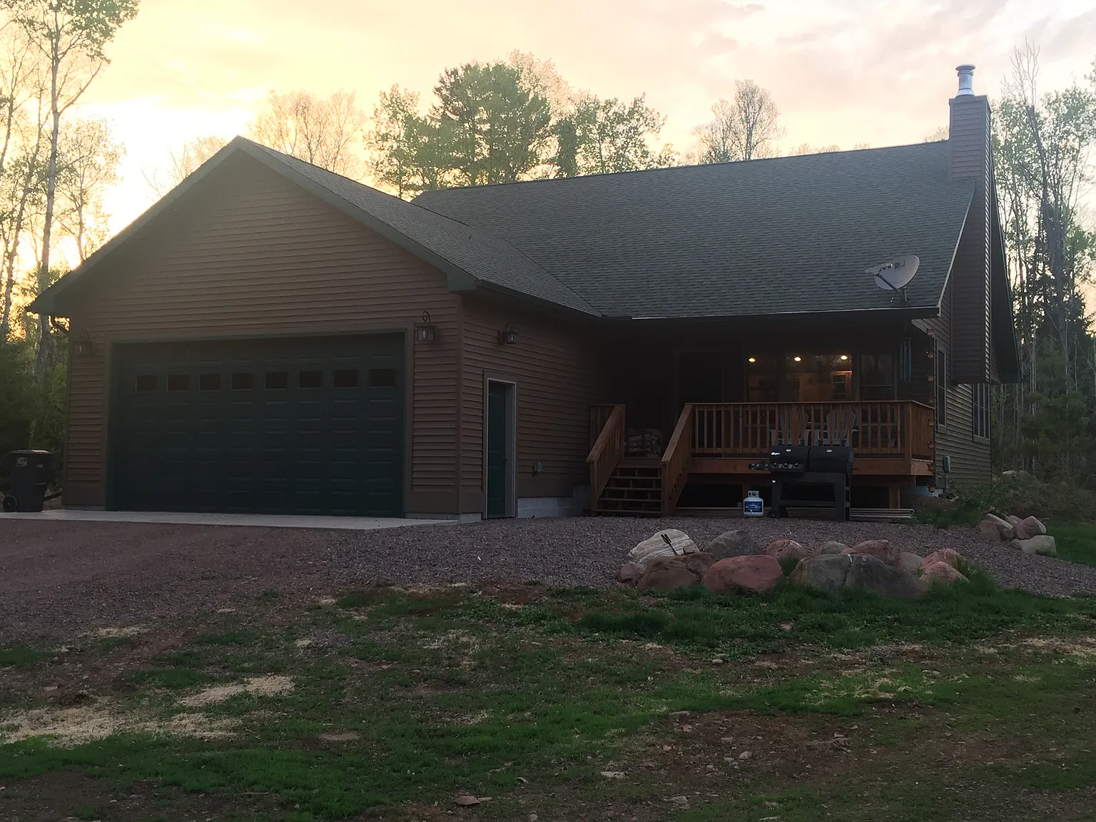 Newly constructed in 2015. 2000+ sq ft. living space. 3 bedrooms, 3 bath home with attached 2 car garage. Master bedroom and bathroom on main level along with office and guest bathroom. 2 bedrooms, bathroom, family room, bar area, and storage areas in basement. Extremely durable bamboo floors throughout main floor. Heated tile floors in all bathrooms and laundry/mud room. Carpeted bedrooms and office. Alder cabinets and doors throughout home. Vogelzang Ponderosa wood stove in main living area can keep entire upper level warm in the winters. Baseboard heating throughout main level, in-floor heat in basement. Energy efficient Anderson windows. Spray foam insulation. Maintenance free vinyl siding. Covered front porch. Covered unfinished back deck runs entire length of the home. Wired for hot tub off master bedroom. Large campfire ring in front yard. This property sits on 5 acres of land on the north side of Devil Track Road. Quick access to Devil Track Lake year round. Snowmobile trails nearby. Separate 2 car garage with studio apartment for guests or for income potential! This home is one of a kind in Cook County and is ready for your family to move in!