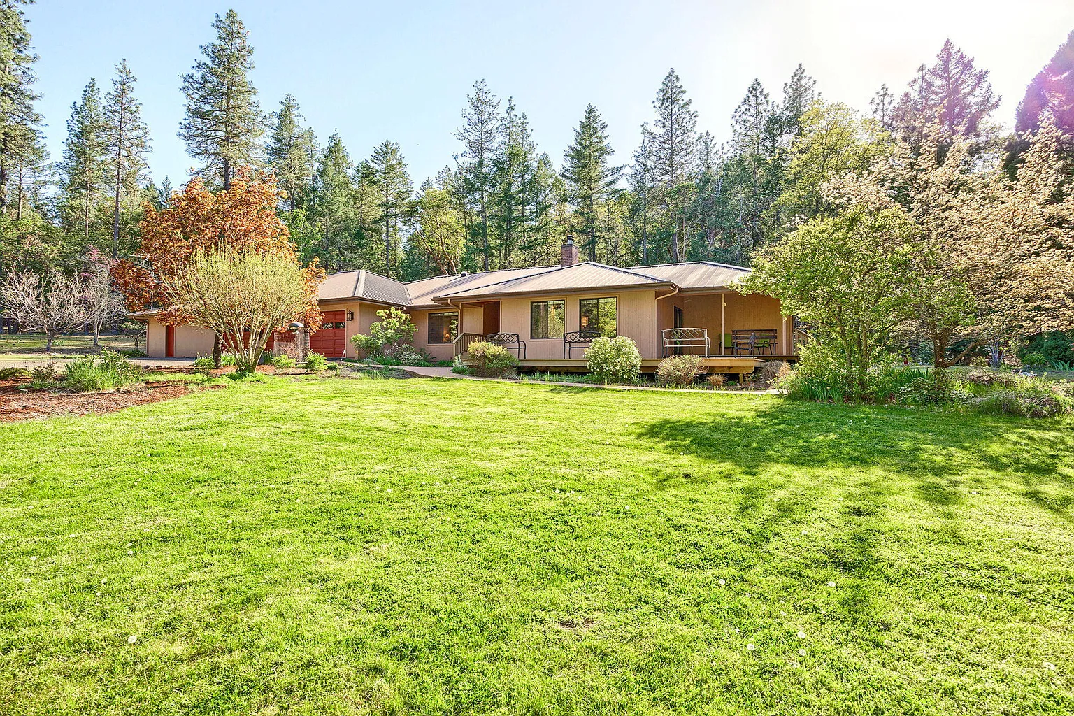 You will feel immediately at home in this custom home 15 minutes from Jacksonville near the Applegate River. The house sits on over 7 acres in a private sun-filled location w/ both open lawn & forest views. Incorporating high ceilings & spacious rms, this home captures you w/ the details that turn a house into a home. The house features main flr living w/ an open concept flrplan, & the primary suite has a private covered patio overlooking the park-like backyard, an ensuite bath & large walk-in closet. The living rm is anchored w/ a woodstove & is open to dining rm & kitchen, which has been completely updated w/ quartz counters, bar seating, stainless appliances, & a large pantry. A huge mud/laundry rm adjoins the 936 sf 3 car garage w/ a storage loft & 546 sf workshop. The house also includes two additional bedrms, full bath, & an office & sunrm. Patio areas on 3 sides follow seasonal sun/shade, taking advantage of the privacy, serenity & abundant wildlife this property has to offer.