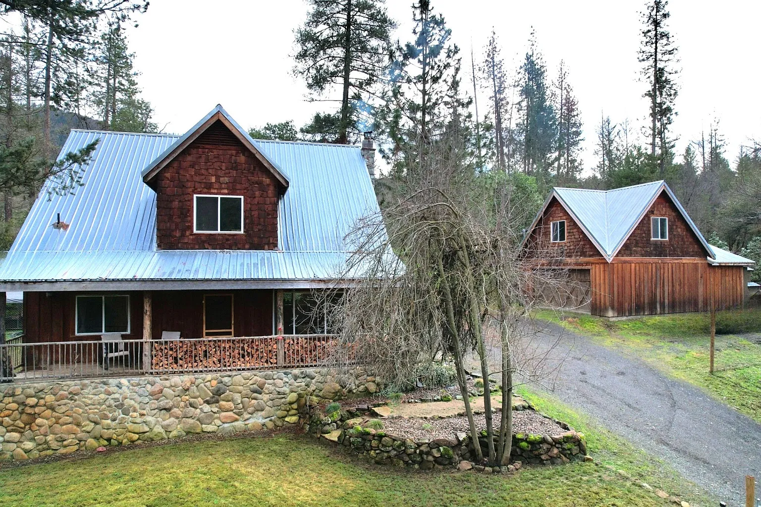 Country Comfort! Custom Home in the beautiful Applegate Valley. Trees and privacy welcome you to this 3.68 acres of trees & useable land. Enter this custom 3bd, 2.5 bth cedar home through a covered porch overlooking the serene, natural landscaped yard. The open living space has wood floors, spacious dining & open to the kitchen w/the cozy wood stove centrally located. 1/2 bath just off the living-rm . Master bedroom on the main level w/clawfoot tub & tile shower. Upstairs, will find a useful bonus room along w/2 more bedrooms & full-bathroom. Nicely landscaped grounds with covered sitting areas, walking paths and room for play. The large, detached garage w/ 450 sq.ft. of living space w/half bath on the upper level. This makes a perfect mini-farm w/ horse stalls, hay barn, chicken coop and fenced areas for animals & gardens. Good producing well w/new pump. This property has all the amenities for fully enjoying the true meaning of living in the country. Only 15 min to Jacksonville.