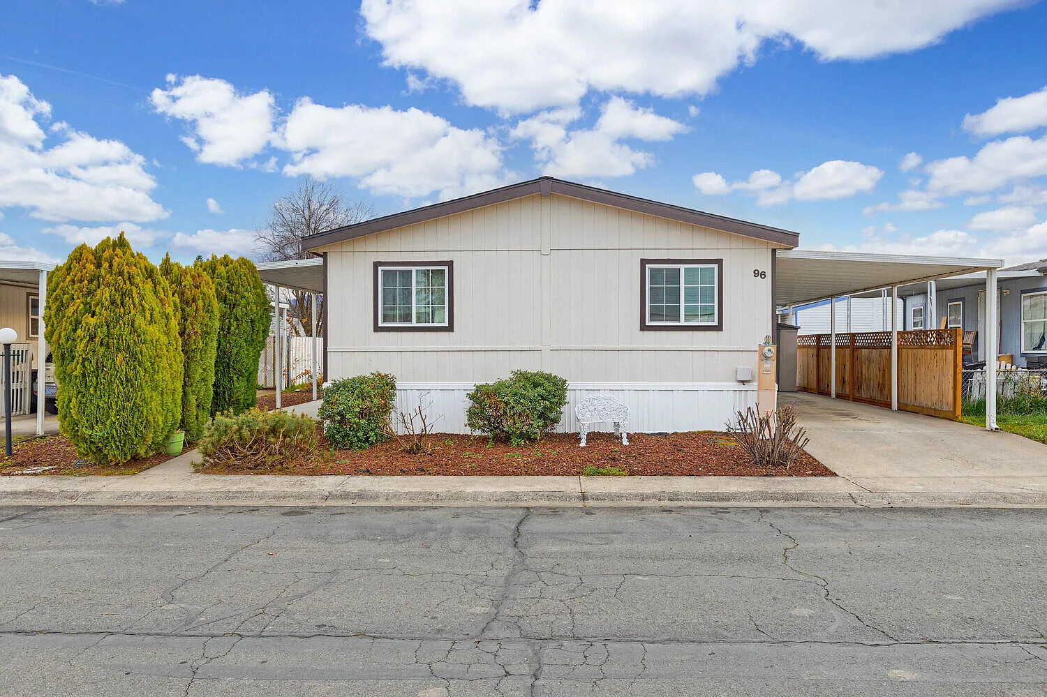 Charming single level home in the peaceful Peachwood Village all-age park of West Medford! This well-maintained 2 bed, 2 bath home offers an open and split floor plan, vaulted ceilings, relaxing primary suite, and upgraded kitchen flooring. New roof in '21 and water heater in '23. Low maintenance landscaping enhances the spacious backyard complete with plenty of room for a garden and extra shed for storage. Great location situated close to shopping and services.