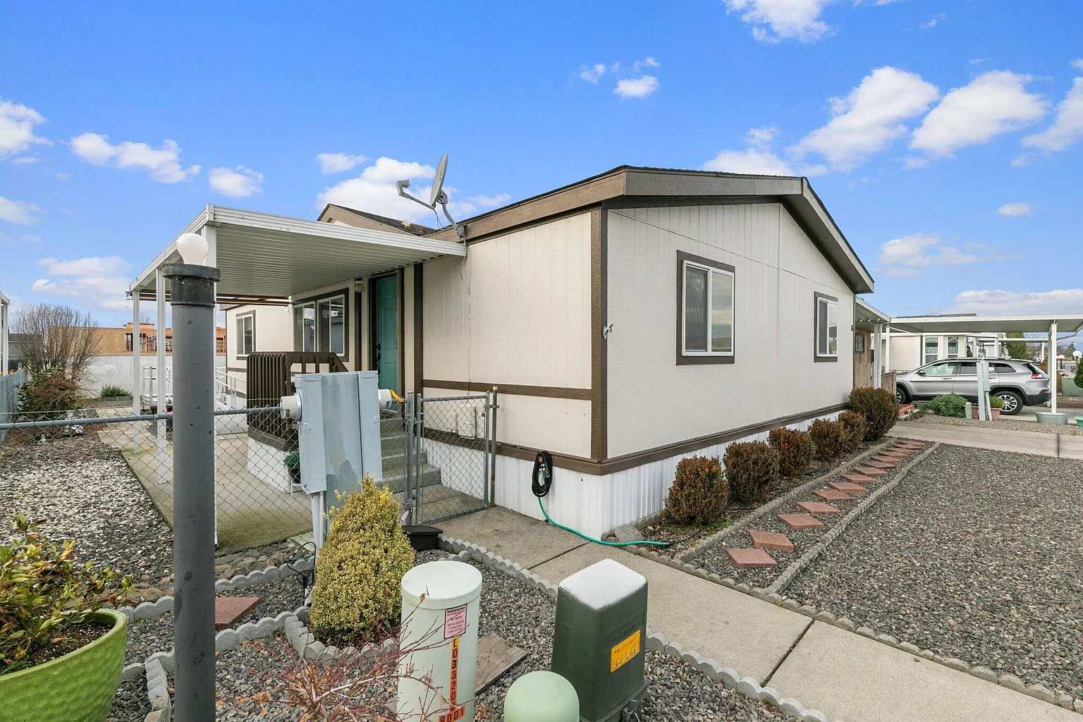 Well-maintained 3-bedroom 2 bath home built in 1999 offers a great opportunity to live in a 55+ community. Home features a recently painted exterior, a large carport, & 2-year-old ramp for access. Inside is spacious with vaulted ceilings, open concept, & split floor plan that makes it perfect for entertaining. Flooring throughout the house and easy-to-use blinds that can be closed from the bottom or top, dishwasher & stove, are all 1-year-old. Large main bedroom with oversized walk-in shower, less than 3 years old. The kitchen offers newer cabinets with plenty of storage space. The laundry area can accommodate a stackable or side-by-side w/d combo. Outside, the home also includes a bonus room for extra storage or exercise room, large covered deck with electric hookups for an additional fridge or freezer, a patio, & nice size storage shed/workshop. A very inviting backyard is fenced with new rock work & landscaping around the property. With low space rent, you won't want to miss this!