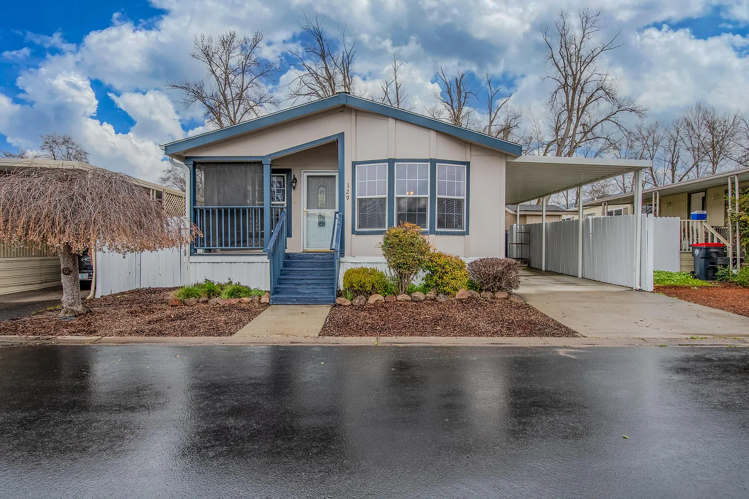 Fenced yards are rare at Medford Estates. Here's one at #129! This 2005 home has 2 bedrooms plus a den & 2 baths in an open floor plan. The living room, dining area & kitchen create the heart of the home. An elevated bar top on the kitchen island provides a space for homework. A breakfast nook by the front windows makes a sunny spot for informal meals. Vaulted ceilings & large vinyl windows lend an airy, spacious feeling. The main bedroom features a walk-in closet, double vanity, shower, & soaking tub in the bath. A screened ''catio'' offers outside enjoyment for the furry family member. Rose bushes, lawn & a patio enhance the fenced backyard. An oversized storage shed in the backyard is handy for bikes, tools & extras. Come home to resort living in this park with a NEW clubhouse with all the bells & whistles including pool, hot tub, BBQ area, billiards room, weight room, & dog park. Why read & dream? Come discover all the features this home & park offer.