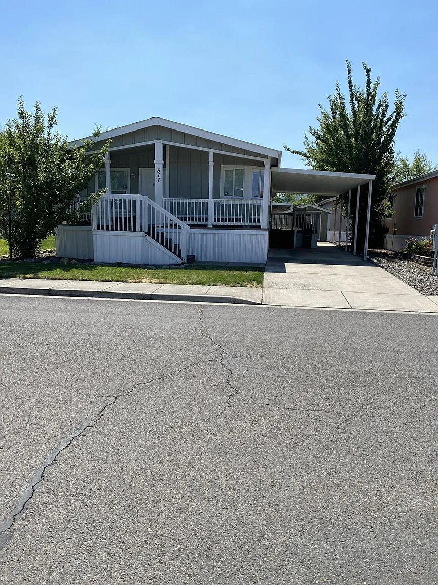 This home sparkles and is truly move-in ready! The living room is light and bright with an adjacent room. The kitchen is *large with plenty of cabinetry, counter space and pantry. All appliances stay (including the washer and dryer) and the microwave new. The hall bath has a tub/shower and single sink vanity. The master en-suite has a walk-in closet, double vanity, large shower and wonderful soaking tub waiting for you at the end of a busy day. The front I deck is inviting and the side dock accesses the covered carport and the storage shed. The San George Estates community is for all ages, Additional park features are an in-ground pool, club house with a full kitchen, and play area.