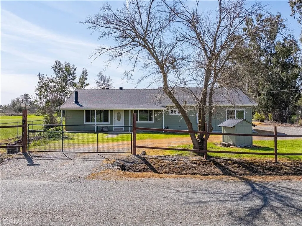 Tucked away on almost an acre fully fenced, this warm and welcoming 3-bedroom, 2-bath home is designed for comfortable living. Drive through the electric gate and take a step inside. You’ll notice the open and airy feel, enhanced by luxury vinyl plank floors, an abundance of sunlight streaming through large windows, and an oversized living space anchored by a freestanding wood stove with an attractive brick backdrop. The kitchen is thoughtfully designed for both everyday living and entertaining. Bright white cabinets, sleek quartz counters, and an electric range offer a clean, modern touch, while the adjacent dining nook makes serving meals effortless. Your private primary suite is a true escape, featuring direct access to the backyard, two spacious walk-in closets, and a spa-like bath complete with dual sinks, plentiful cabinetry, tile flooring, and an impressive walk-in shower wrapped in tile. Practical perks include an indoor laundry room with storage, two comfortable guest bedrooms, linen storage, and ceiling fans in multiple rooms. Outside, you’ll find a detached two-car garage with an additional storage bay, a storage shed, and a covered patio ideal for gatherings or lazy afternoons. With a peaceful setting, generous lot size, and a long list of features, this home offers the perfect blend of country charm and modern convenience.