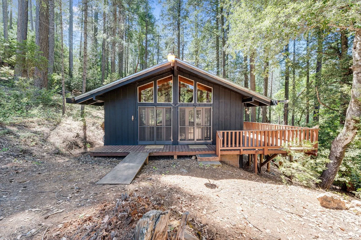 This charming cabin sits lakefront on one private acre of beautiful Chiquita Lake - just 20 steps from your spacious deck to peaceful morning swims, fishing sessions, picnics on the floating dock, and sunset paddles shared with just a few neighboring families. This cozy retreat perfectly blends rustic charm with modern comfort, featuring a stunning stone fireplace for intimate evenings, beautiful vaulted ceilings, and an open floor plan with two comfortable bedrooms. The thoughtfully updated kitchen boasts gleaming quartz countertops - this cabin is move-in ready for every outdoor enthusiast. Situated just outside Georgetown, California, this cabin puts you at the center of outdoor recreation. You're minutes from the famous Rubicon Trail for off-roading, with extensive hiking and biking trails throughout the Sierra Nevada foothills. The surrounding area offers an ideal basecamp for exploring rugged wilderness while returning to your quiet lakefront retreat each evening. This ideally located cabin offers the perfect blend of relaxation and adventure - your private slice of paradise on beautiful Chiquita Lake!