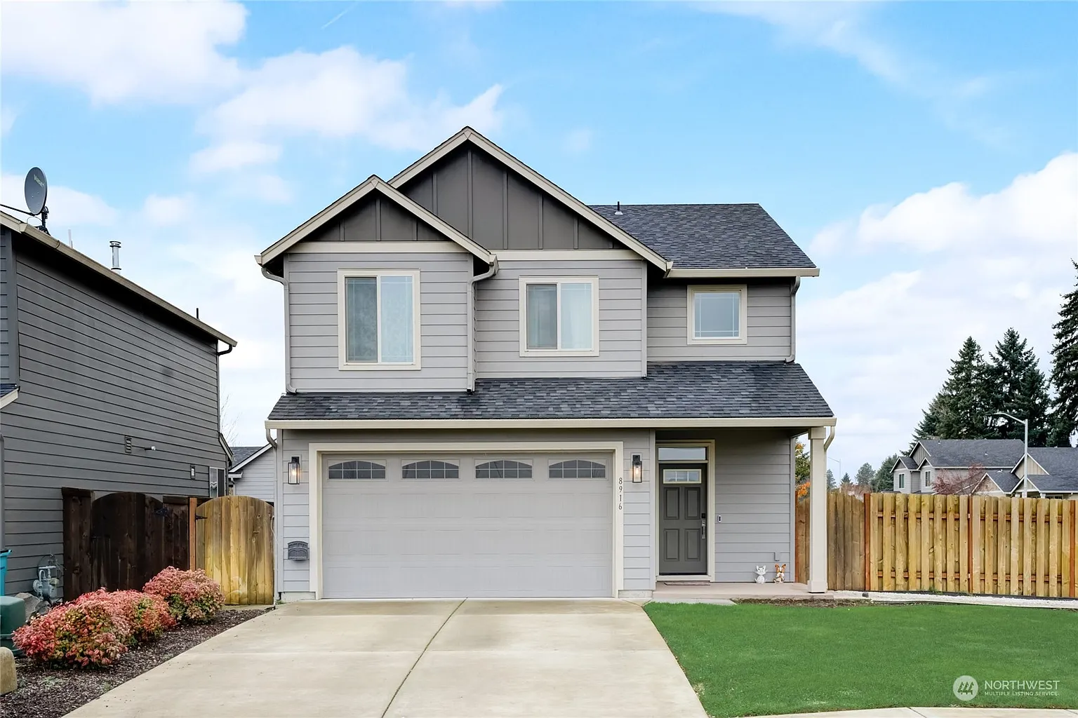 This exquisite 3bd, 2.5bth heaven is a perfect blend of elegance and comfort. Freshly painted in 2022! Outdoors there is a covered pergola and patio, perfect for entertaining or simply unwinding in the fresh Pacific NW air. The kitchen boasts a stylish tile backsplash, upgraded faucet, stained cabinetry, slab granite countertops, and high-end SS LG appls. High wear-layer LVP flooring throughout, providing durability and waterproof functionality. Stay comfortable year-round with an efficient heat pump and A/C, complemented by a WiFi-enabled thermostat. A 48-amp WiFi-enabled electric car charger is ready to power your sustainable adventures. Ample parking in the front and side of the house. Low-maintenance front and backyard with flower beds!