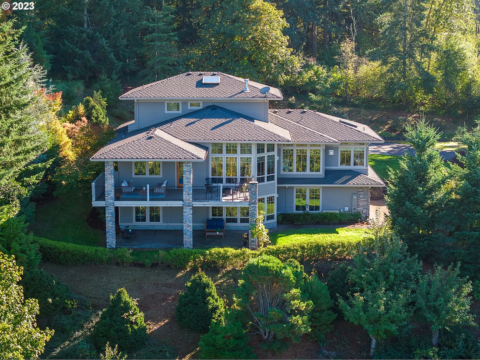 VERY RARE FIND! Incredible views from downtown Portland to 3 majestic mountains and rolling hills as far as the eye can see! Private, gated custom home on 3.4 acres with two primary suites! Entertainer's deck! Walk-in closets in all four bedrooms. Has very high demand Main Level Living! This gem boasts a gourmet chef's kitchen, Butler's pantry, large eat-in kitchen area, formal dining, incredible floor to high ceiling windows, hardwood floors, office, huge walk-in shower with heated floors, 2-sided fireplace from primary bedroom to the foot of a luxurious soaker/air tub, 8' tall solid wood doors throughout! 3 car garage and house generator. Lower level has guest primary suite/ADU potential with large indoor/outdoor living space and separate entry. Beautiful waterfall feature, landscaped grounds with vast irrigation system and land with tons of potential, a gardener's paradise! Nearby walking trails. Amazing property and private oasis!