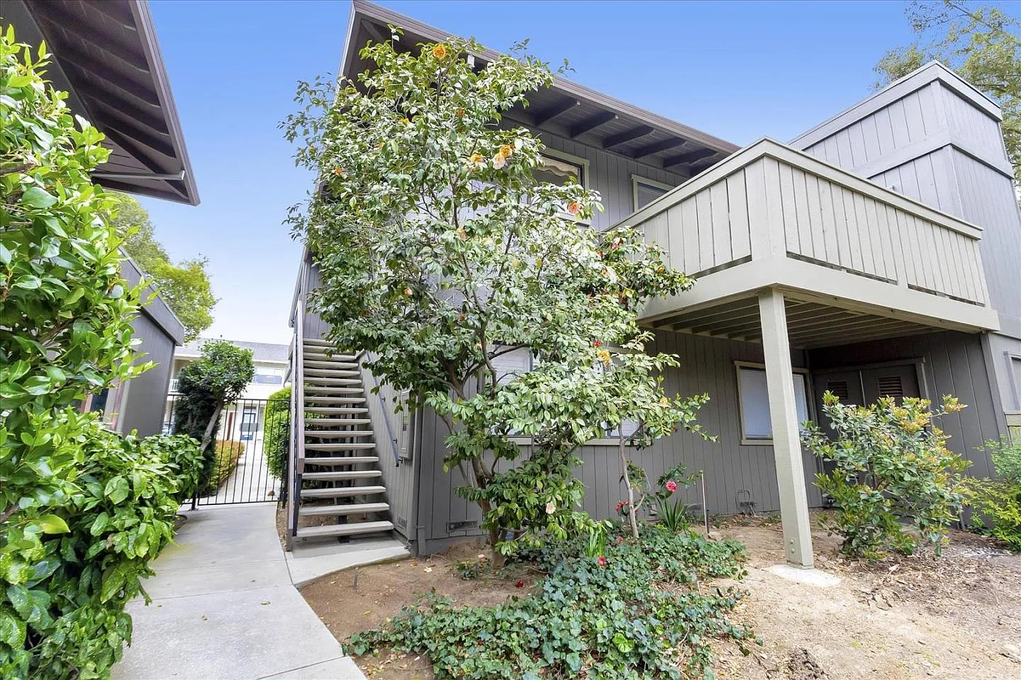 Feel like you're on vacation the moment you step in the door.Tucked away is this end unit condominium with a unique living environment, open and airy floor plan and an array of windows overlooking mature trees and sparkling poolside setting. Saratoga Inn Place is a small complex with only 24 units.This upstairs end unit has large rooms with lots of light, vaulted wood beamed ceiling, gas replace, hardwood floors and an eat-in kitchen ready for you to add your own personal touches.The spacious living and dining room opens to a large deck with storage closet. 2 updated baths with tiled tub and walk-in shower and in-unit full-size laundry. Convenient 1-car garage plus reserved parking space. Walk to charming downtown Saratoga boutiques, cafes, diverse dining, Farmers market and Wildwood Park. Minutes to Safeway, CVS, highways 85/280/17.This unique property inspires those who seek a private retreat for entertaining, relaxation and walking trails, gardens and award winning Saratoga schools!