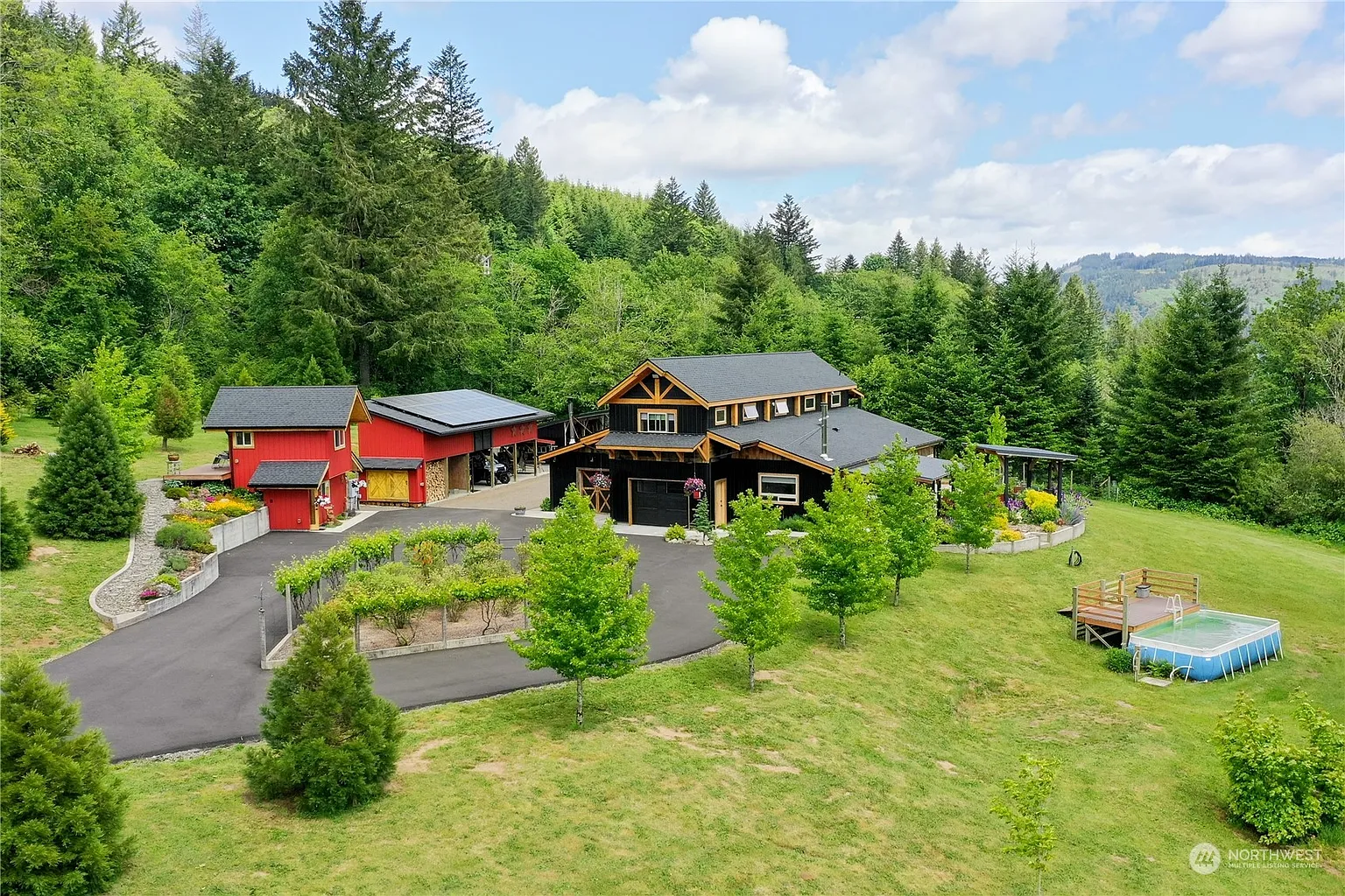 Welcome home! One of a kind, custom barndominium is located on over 8 beautifully wooded acres with a view of. Mt. Hood and the Lewis River Valley. Gated, mostly fenced with blacktop driveway. Built to last, this home goes beyond standard code requirements. Living room w/wood stove opens to kitchen w/ stainless appliances. Spacious primary w/bathroom with walk-in tile shower. The upstairs w/own entrance, can be used as a separate apartment & custom tiny home is perfect for short term rental income! Barn with plenty of storage, garden shed. Solar panels, reservoir. Fenced 60’ x 60' ft. garden & orchard. Landscaped back porch with wood stove that is perfect for summer nights. So much more! Seriously, you must see this property to appreciate!