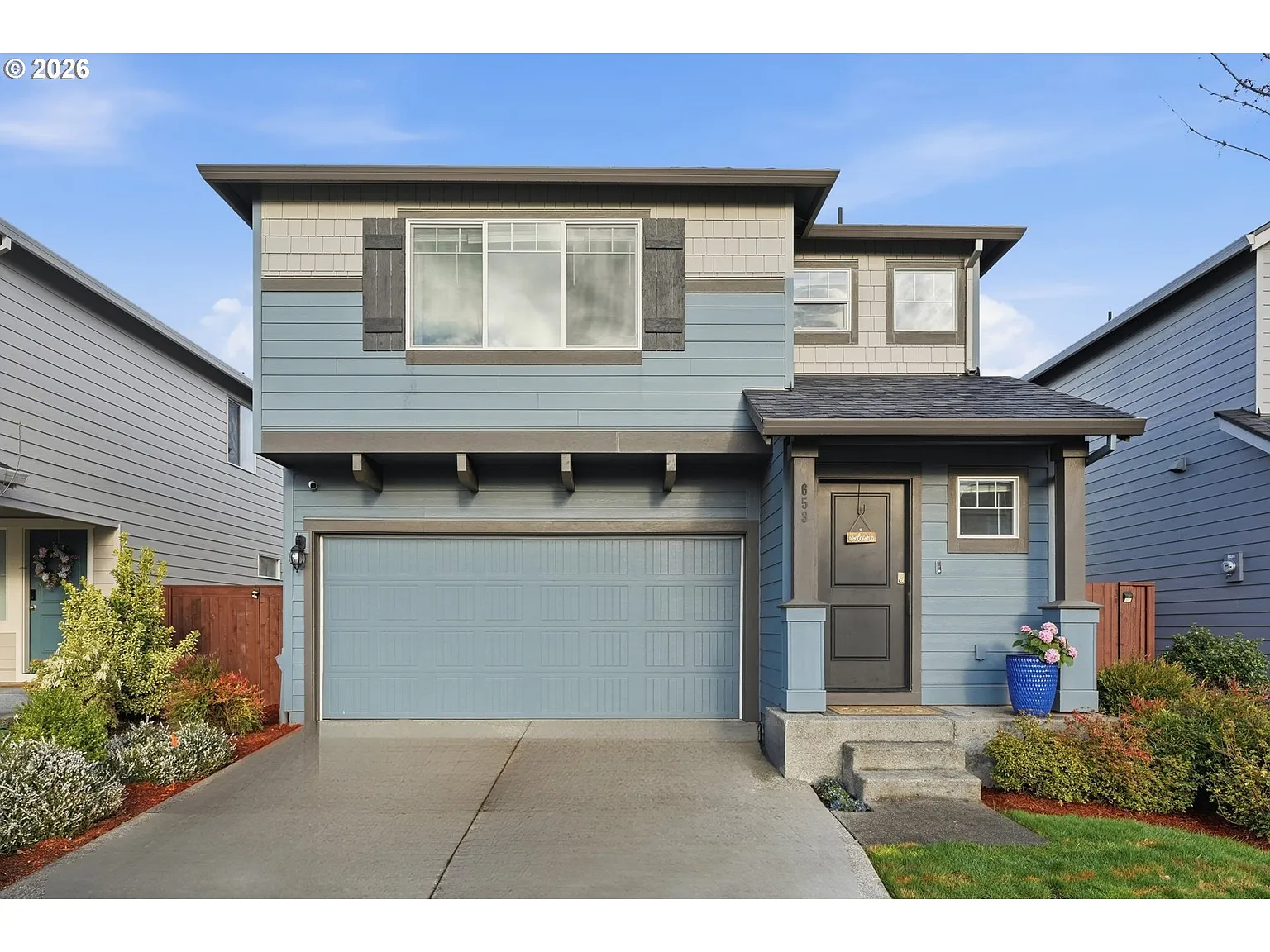 Welcome to this light-filled home offering an open-concept layout, spacious living areas, and an easy indoor-outdoor lifestyle. The main level features durable laminate flooring and soaring ceilings that enhance the bright feel throughout. The living room, dining area, and kitchen connect seamlessly, creating a natural flow that’s ideal for both everyday living and entertaining. The kitchen features stainless steel appliances, a gas range, a pantry for added storage, and a generously sized island with bar seating, making it a true centerpiece of the home. Just off the dining area, sliding glass doors open to a completely level, fully fenced backyard with a patio—perfect for outdoor dining and relaxing evenings. Upstairs, all four spacious bedrooms are thoughtfully positioned all on one level, offering both convenience and privacy. The upper level also includes a dedicated laundry room. High ceilings continue throughout, creating a sense of openness in every room. Situated in a quiet, well-maintained neighborhood with manicured sidewalks and low HOA dues, this home offers a balance of comfort and convenience. Located just minutes from Mill Plain’s newest restaurants, shopping, and with quick access to I-205, you’ll enjoy easy commuting while being minutes from everything you need. A rare combination of layout, livability, and location—this home is ready to welcome you.