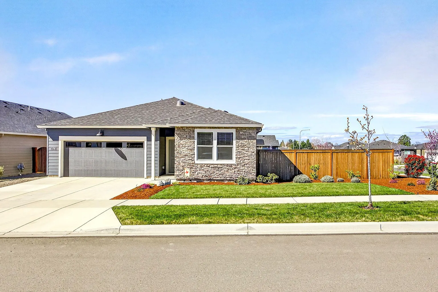 Beautifully maintained and hard-to-find 3-bedroom, 2-bath single-level home built in 2023, located in the desirable Cedar Landing community. This 1,460 sq ft home features an open-concept floor plan with sleek finishes, quartz countertops, stainless steel appliances, and abundant storage throughout. The spacious great room with an electric fireplace creates a warm and inviting space for relaxing or entertaining. Step outside to a large backyard with a covered patio--perfect for outdoor gatherings, gardening, or year-round enjoyment. Situated on a .20-acre lot with a 2-car garage and offering beautiful views of Roxy Ann Peak, this home blends modern design, comfort, and functionality. Conveniently located near Cedar Links Park, featuring pickleball and basketball courts, a playground, dog park, covered picnic area, and walking paths. Move-in ready and better than new!