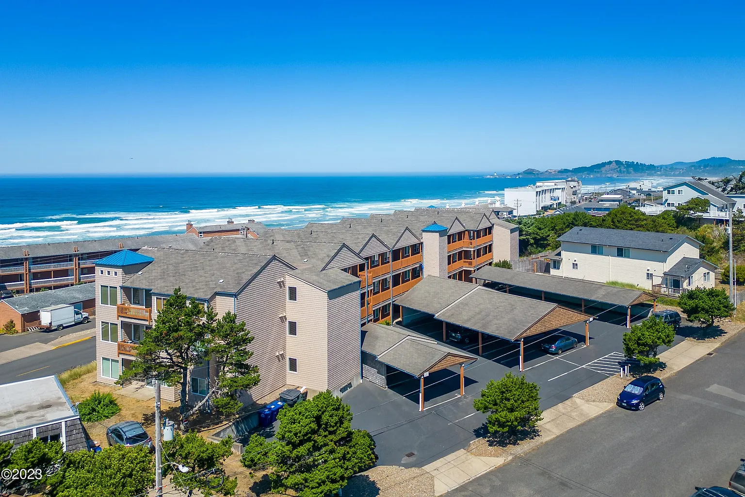 Amazing Ocean views, sunsets and whale watching too! This top floor unit features 2 bedroom and 2 full baths in an open floor plan with vaulted ceilings and cozy window seat and deck to enjoy the ocean and lighthouse views! Unit comes with 1 covered carport space for parking. Short distance to paved beach access and Nye Beach is down the street. You can't beat this location or the view. This is a great place to call home!