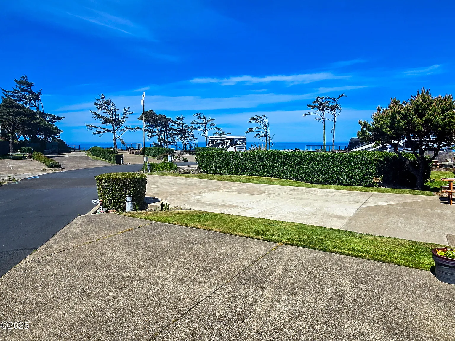 Lovely ''seasonal'' Ocean View back in lot on the southern side of this ocean front resort, with expanded block patio and close proximity to resort clubhouse. The clubhouse also provides access to an owners-only lounge, gym, and kitchen, with an all guest access to indoor pool, spa, and sauna. Plus well cared for and large laundry facilities! Just around the corner from the private trails to beach, and the resort also offers pickle ball courts. You won't find another RV resort like this on the Oregon Coast!
