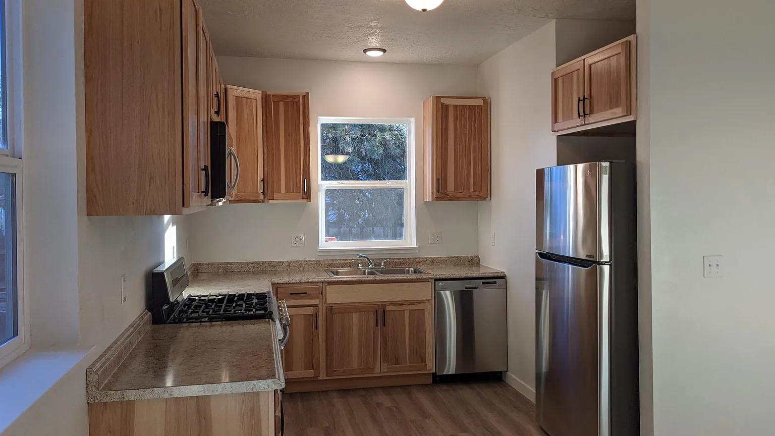 New construction Units located on flag lot well off the street Energy efficient construction with high efficiency heat pumps for heat and cooling 9ft ceilings Furnished with refrigerator, gas stove, micro-hood combo and dishwasher W/D hook ups Attached single-car garage Rent also includes Water, Sewer and Garbage.