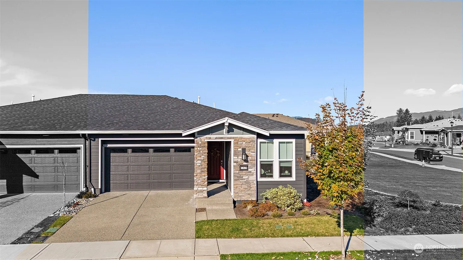 Active 55+ community, Meadow Ridge! 2 bedroom + office rambler marries style with function.Former model home on a corner lot with builder upgrades +EV charging, A/C, blinds, pull out pantry shelving. Open concept floorplan perfect for both entertaining and every day living. Center island kitchen with breakfast bar, Silestone counters, SS appliances, under cabinet lighting and 10' ceilings with recessed lighting. Tons of windows throughout with custom top-down/bottom up blinds (blackout in primary) for natural light and privacy. Covered patio to BBQ or access paved walking trail to Starbucks or the community clubhouse for indoor/outdoor gatherings. Ideal location close to all amenities Maple Valley has to offer!