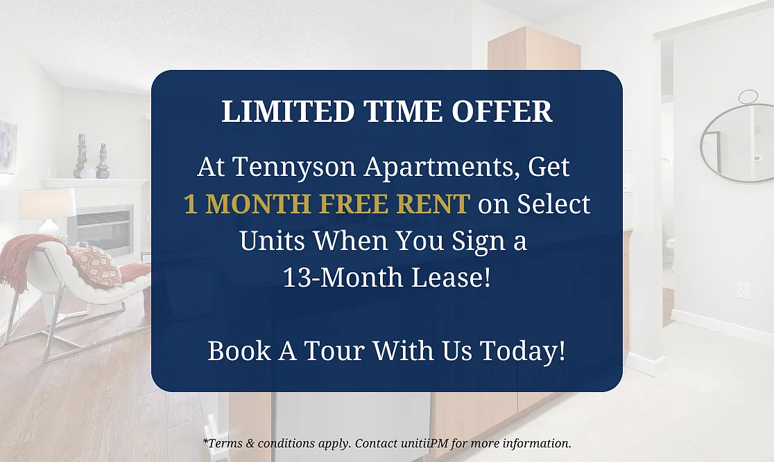 Tennyson Apartments | 2 MONTHS FREE RENT Tennyson Apartments are located in the sought-after neighborhood of Terra Losa, offering an ideal setting for mature adults with an active lifestyle. With convenient access to public transit, shopping centers, parks, and essential services, everything you need is within easy reach. Each suite is thoughtfully designed with modern features to enhance your daily living: In-suite laundry for added convenience Dishwasher and microwave to simplify meal preparation Private balcony for relaxing or entertaining Electric fireplace to stay warm during winter Choose from one- or two-bedroom apartments, all freshly painted and move-in ready. Heat and water are included in the rent to give you peace of mind. We are also pet-friendly, welcoming both cats and dogs: $35/month per cat $50/month per dog (maximum weight 50 lbs) Tennyson Apartments offer a blend of comfort, convenience, and communitymaking them the perfect place to call home. unitiiPM Features and Discounts: TELUS Discount: As a resident of unitiiPM, you're eligible for a 25% discount on TELUS Optik TV & Internet. Contact your building manager for more details. Zenbase Smart Payments: unitiiPM has partnered with Zenbase to offer smart rent payments that build your credit automatically and can be divided into manageable, stress-free payments.