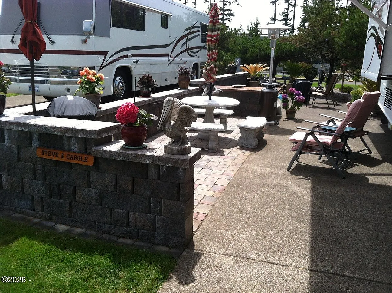 Beautiful back in lot. Expended paved sitting area; a privacy wall; granite tabletop with hidden storage underneath. Pacific Shores Motorcoach Resort is located on a bluff overlooking the Pacific Ocean and has a breath-taking lighthouse view. Nature walking trails through the woods and private access to our uncrowded beautifully photogenic beach. A large clubhouse and owner's only lounge, gym and kitchen. Indoor and outdoor pools and spas along with our hot sauna steam room.