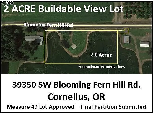 2.0 Acre Buildable 5 Mountain View (Rainier, St Helens, Adams, Hood, Mt Jefferson) Utilities at site. Shared Well. 1000 gal Septic Tank & Drain Field in place. Measure 49 lot approved (Completion & Recording of lot expected by April 1st. 25 minutes to Intel and Genentech. Paved Rd. Bring your plans for a Dream Home.Zoned AF-20.