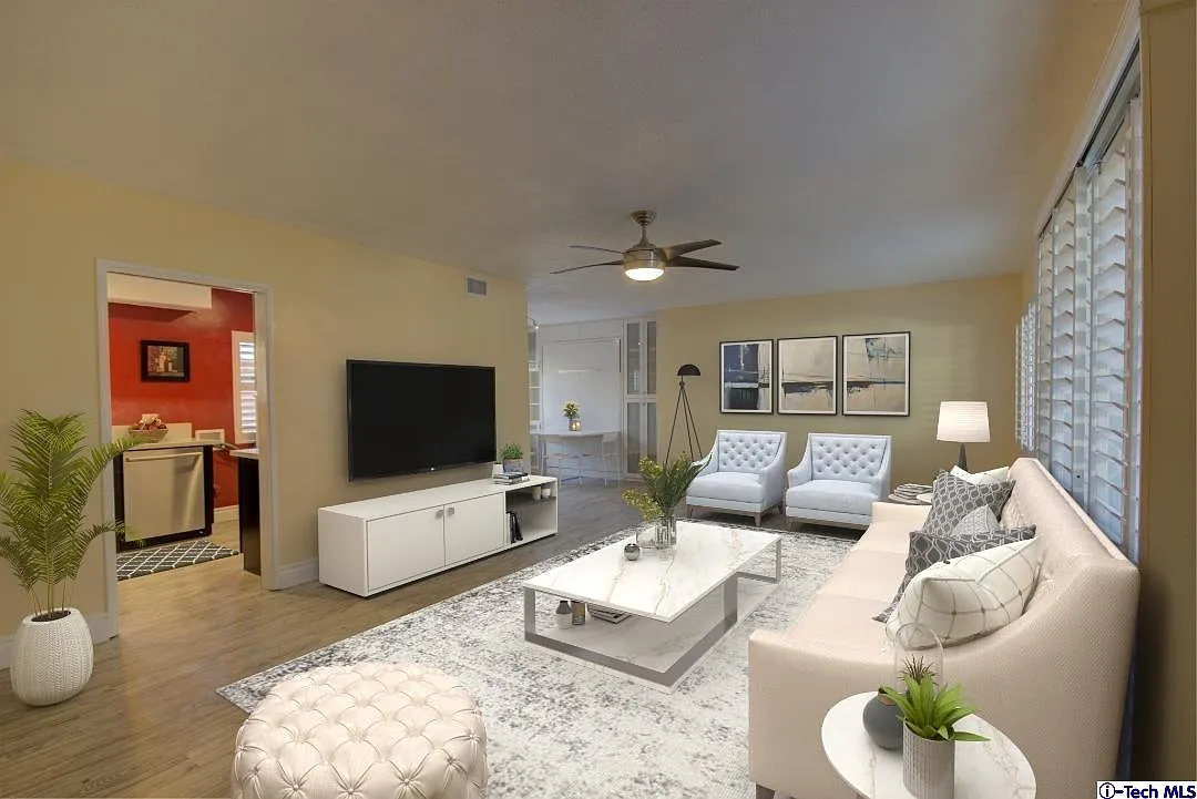 Captivating fully remodeled single-story condo in Northwest Glendale with UTILITIES INCLUDED in HOA dues! Ground floor, approximately 1,300 sq unit features 2 bedrooms and 2 bathrooms with high end touches throughout. Waterproof, high quality SPC flooring welcome you as you enter large living room. Dining room has a unique custom hidden wall bed/dining combo feature. With a simple pull, dining table folds away and a queen size bed appears. Kitchen features Stainless steel Bosch/Kitchen Aid appliances, quartz countertop and Electrolux Steam Washer/Dryer with Pedestals IQ Touch. Spacious primary bedroom features custom tri-panel frosted glass doors and plantation shutters as do all the newer windows found throughout unit. En-suite bathroom features mosaic tiled shower, Euro style vanity and custom storage/linen unit. An office/study area adjacent to primary bedroom is also available. The second bedroom also features a unique custom made built in, a hidden wall bunk bed. Simply pull down and 2 twin size beds appear! Guest bathroom features a floating vanity with vessel sink and quartz countertop and a full-size tub. Too many features to list on this corner unit, with only one common wall and near elevator unit. It also features a private front patio with interlocking solid acacia wood deck, 2 parking space and ample storage. Centrally locked near Ralphs Grocery store which is a few hundred feet to the north, minutes from Americana, Galleria, Brand Blvd of shops & eateries and fr