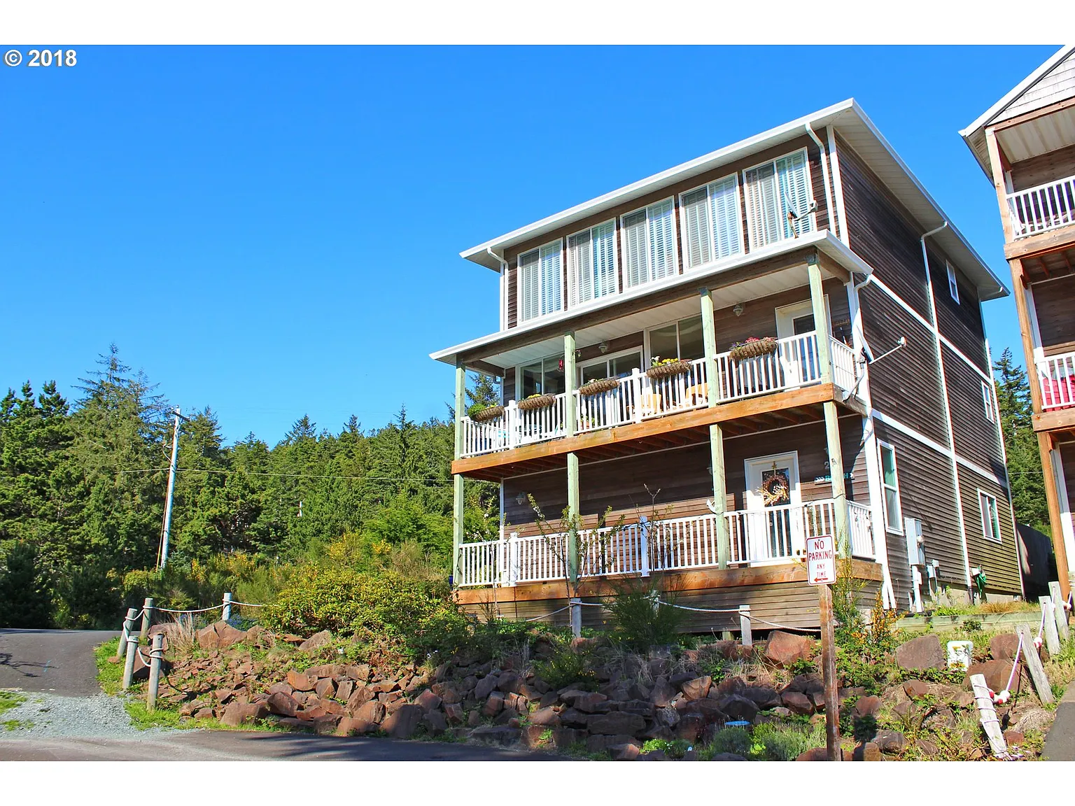 OCEANVIEW CHARMER with 2 levels of view decks, 3 living room areas, 2 frplcs, lots of parking, beautiful finishes including rich hickory hardwood floors, wood cabinets, granite counters. Wonderful houseplan for a beach house, party house or vacation rental. Would be ideal B&B or shared by 2 groups. 2 master suites: 1 on top floor & 1 on ground level, each with wetbar/kitchenette. Ground floor suite has private yard & patio with hot tub.