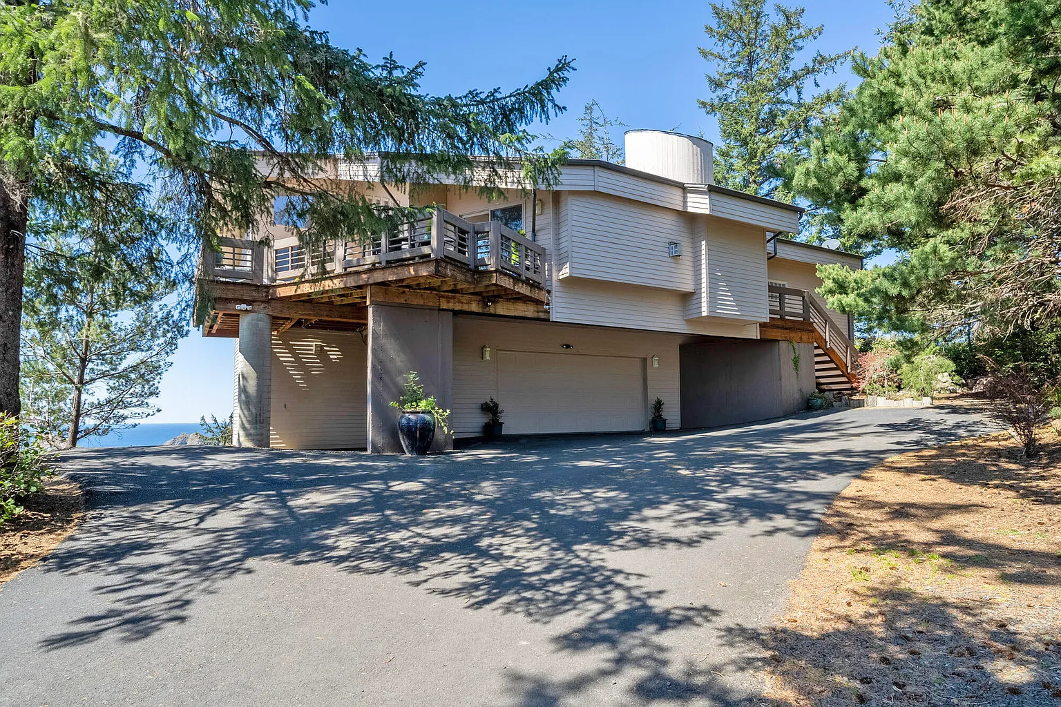 EXQUISITE and dramatic contemporary home at end of private drive. Signature design by artist William F. Weaver, brilliantly laid out to maximize the protected ocean views which include Three Arch Rocks, Maxwell Point, village lights, sandy beach, and majestic Cape Lookout. Anywhere you look in this distinctive home, you'll be entertained with style, beauty, and spectacular vistas. 3 fireplaces, 6 private decks. Secluded setting. Guest suite separate from main house provides ideal opportunity for multi-generational living.