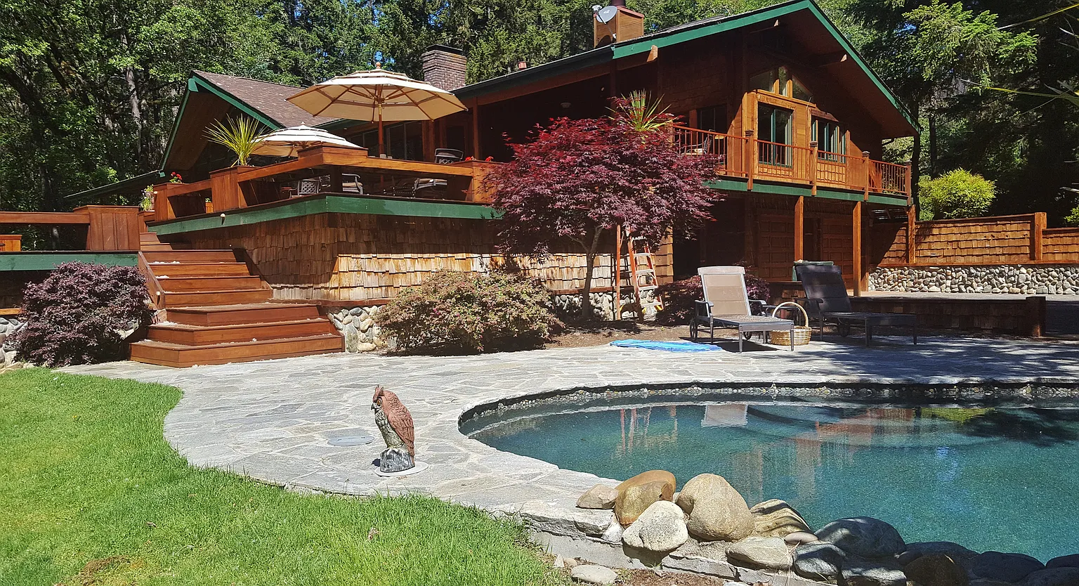 Spectacular Luxury Park Like Estate on the Rogue River! This Luxury Estate feat. over 5800 sqft. that overlooks the majestic river from the second you go through the grand entry & living room all the way through to the multi-level tiger wood deck. Mature landscape, trees & medium to low bank manicured/irrigated lawns roll into one of the finest Salmon/Steelhead stretches on the Rogue just downstream from Pierce Rifle Park. This exclusive home & property is truly one of the finest riverfront acreages in Southern Oregon. This magnificent home has rustic beams, tiger wood flrs, vaulted cedar ceilings w/floor to ceiling picture windows, granite counters, wet bar, wine cellar, river rock accents, stone fireplace surrounds, tile shower/bathrooms, skylights, commercial style kitchen & appliances, gaming area, fitness room, lagoon style pool w/water feat., paved drive, portico front entry, security gate, full sized shop, RV Pkg w/50 amp power & full hook up. Detached guest quarters/art studio.