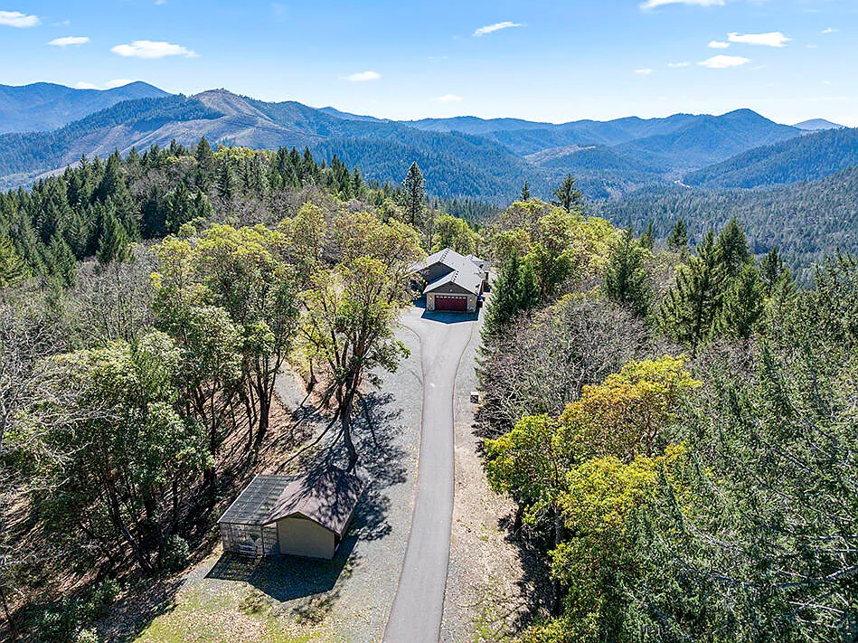 PANORAMIC VALLEY VIEWS on nearly 41 private acres! Behind a gated entry and perched above the valley, this beautifully maintained single-level home offers privacy, wildlife, and breathtaking scenery. Built in 2005, the 1,876 sq ft home features 3 bedrooms and 2 bathrooms with an open layout, vaulted ceilings, and large windows framing incredible views. The living room centers around a propane fireplace with stacked stone surround, while the kitchen offers granite countertops, a generous pantry, and included stainless steel appliances updated in 2021. Upgraded Hickory hardwood flooring and interior/exterior paint add warmth and style. The primary suite includes a spa-like bath and walk-in closet. Enjoy sunsets and wildlife from the covered wraparound porch. Property upgrades include a new well, 2,500-gallon underground water tank, ozone water treatment system, newer pump house, owned propane tank, underground power, small workshop, RV parking, and generator-ready setup.