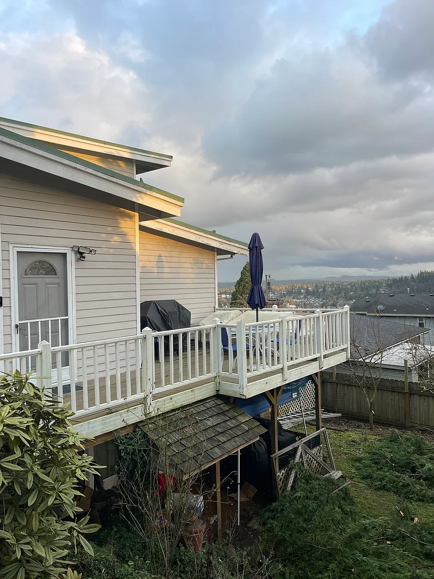 Upper unit of a triplex front door access at grade. Two bedrooms and bath. The large kitchen is spacious enough for a dining table, open living room with views across the valley and Mt. Hood. Deck large enough for outdoor living. The location is ideal, at the top of a large hill with easy access to nearby shopping, schools and nature. West Linn townhouse in the Sunset area. Wooden floors throughout. A large deck for outside living, in close proximity to the grade school, park, high school and Forested trails. Near markets and easy access to freeways. Located in a quiet neighborhood with views of Mt. Hood and the Willamette River valley. Basic utilities included: water, sewer, Electric and garbage. Small shared yard, off street parking. Will consider pets on a pet by pet basis. Month to month rent.