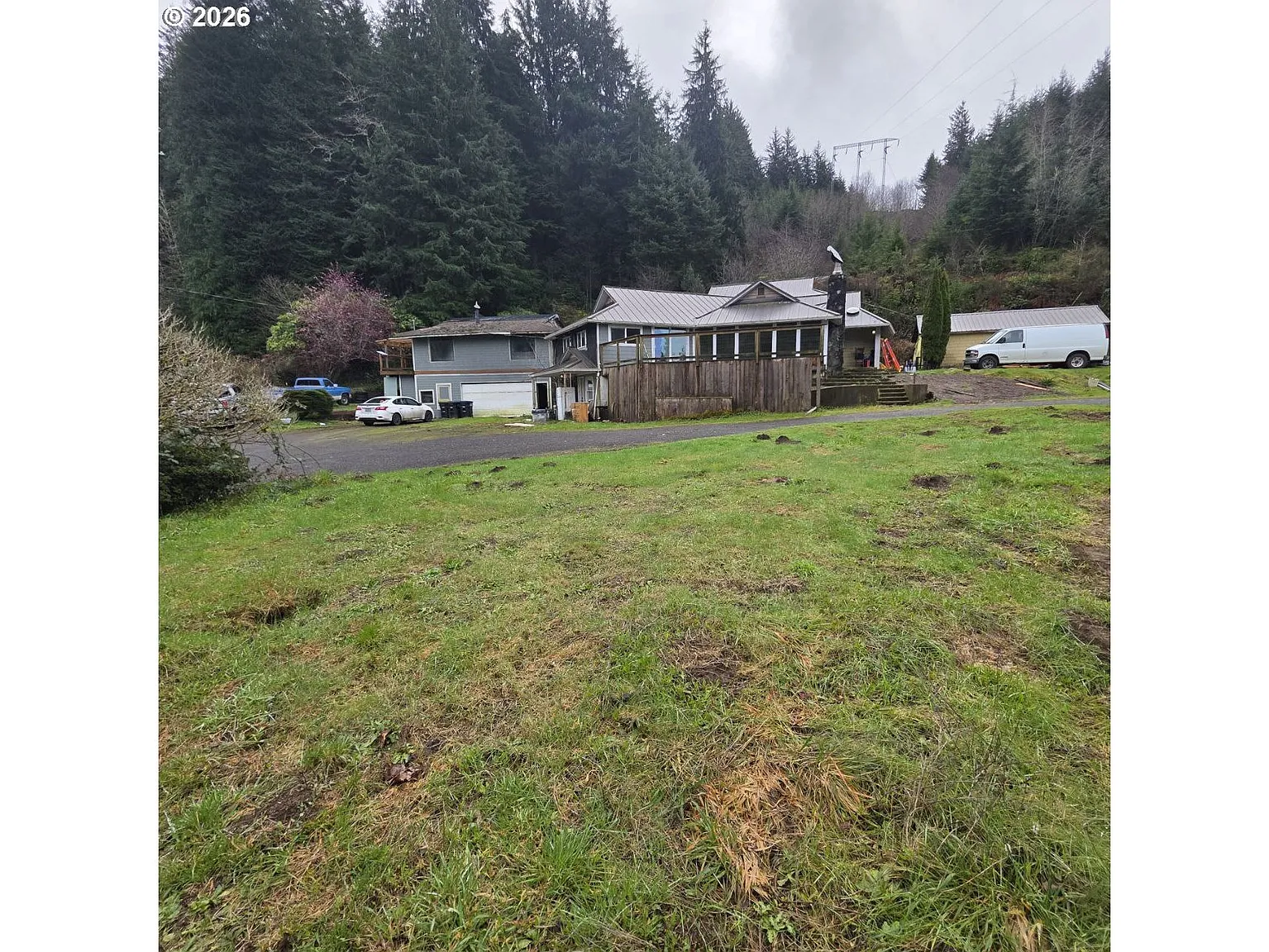 Nearly 5 acres overlooking the Alsea River with private dock (needs repair) and river access. Features circular drive, chicken coop, greenhouse, and 12x12 shed. Detached 2-car garage with 1/1 ADU and kitchenette above. Three-level main home offers space and flexibility in a scenic, rural setting with room to make it your own.