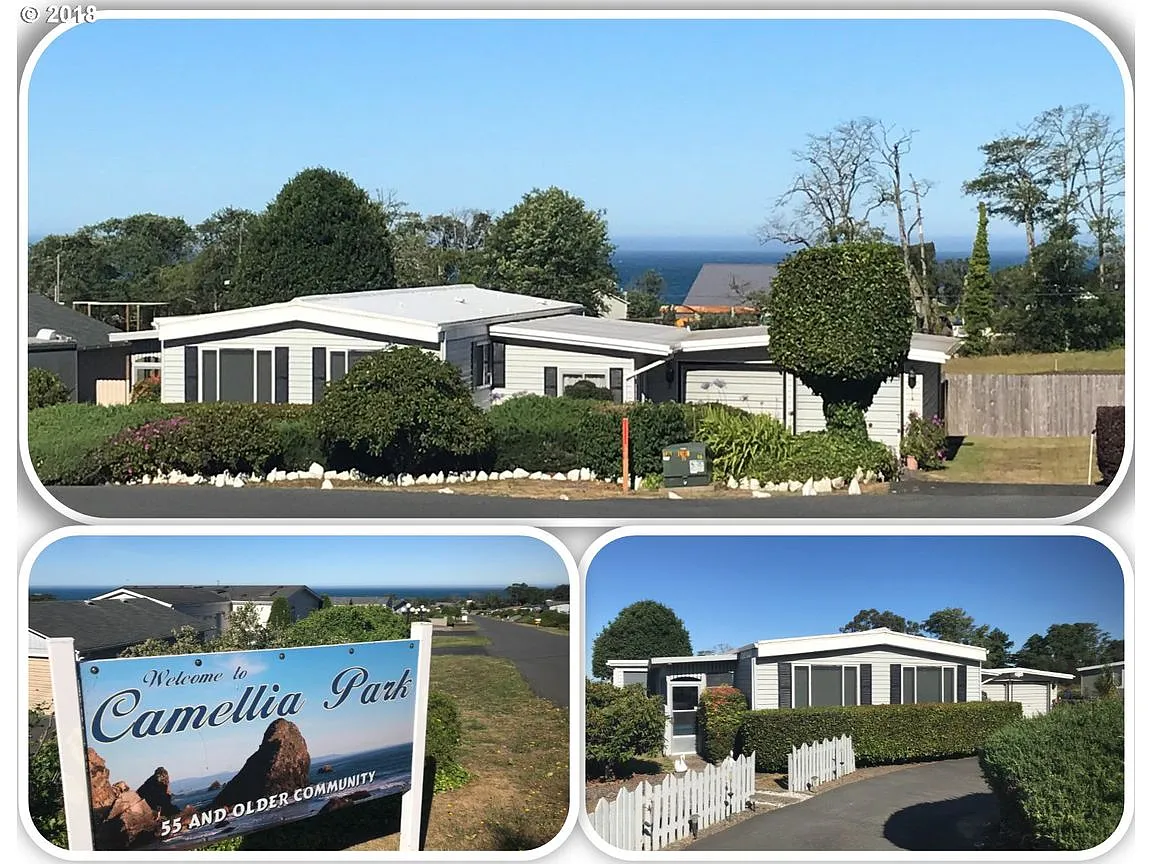 OCEAN VIEWS from this well maintained home in the desirable 55+ community of Camellia Park! Plus you OWN the land! This cute beach manufactured cottage has 2 bedrooms, 2 baths PLUS a possible bedroom & full bath off the garage! Additional living space with added family and sun rooms. Beautifully maintained yard with room to garden and enjoy the ocean views! Even has room for RV or boat! A great fisherman's retreat and priced to sell!!!