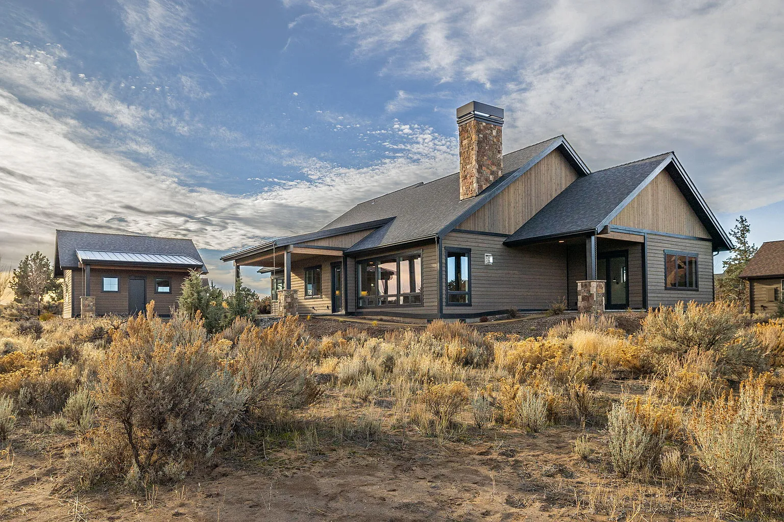 Nestled in the high-desert landscape of Brasada Ranch, this 2968 sqft custom home offers luxury living. The kitchen is a chef's dream with stainless appliances, including a 6 burner Thermador 48'' range, and a built-in fridge/freezer. An oversized pantry with a barn door adds to the convenience, with room for a second fridge. Quartz countertops throughout the home, including a waterfall island with a built-in table, exemplify modern luxury. The formal dining area includes built-ins, and a butler's pantry with a wine fridge. The primary suite features a tile shower, two vanities, space for a stacking washer/dryer, walk-in closet, and a soaking tub. Unique to this home are the high end black Milgard fiberglass windows, a gorgeous laundry room, a junior suite, a built-in bench by the owner's entrance, hardwood floors, Montana mossy rock, tile and wood accent walls, 8' solid stained fir interior doors, and custom cabinetry.