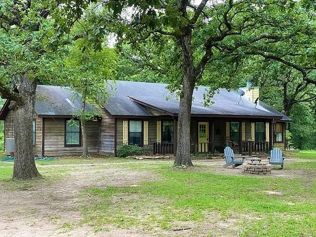 Perfect location between DFW & Houston! A quiet place to call home & relax under a canopy of trees. Beautiful views from every side whether you are on the front porch swing or on the back deck that extends around one side of the home. Approx. 15 acres outside city limits dotted with huge trees & thriving with wildlife, perimeter fenced, pasture grazing , 2 water wells. Spacious 3 bed, 2 bath, living rm with WBFP, den with lots of windows. Cheerful, white tile kitchen with appl incl, formal dining central to both living rms & kitchen, sep laundry rm, Primary bdroom has divided bath (tub&shower), bedrms 2 & 3 share a divided bath. Double door det garage with hobby rm. 20 min to Palestine & 15 min to I-45.