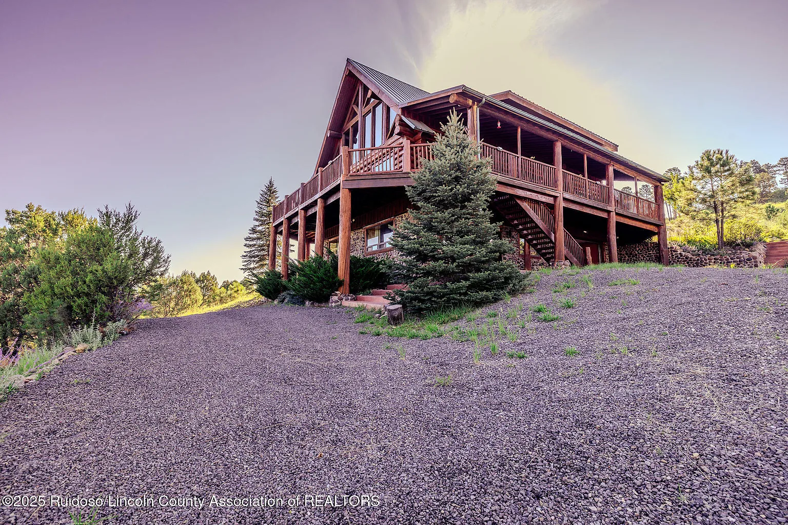 This fully furnished log home, over 4500 Sq. Ft. (according to tax records) includes a golf membership at Alto Lakes Golf & Country Club and charming artwork. Recent updates feature new staining, paint, flooring, and mini-split systems. The kitchen appliances, bathroom vanities, and lighting fixtures are all new, making it move-in ready. Sitting on an acre, it boasts unique details like hand-peeled Canadian lodge poles, a river rock fireplace with views, and a spacious great room. The main level master suite has a sunroom and laundry area. Enjoy 1,000 Sq. Ft. of covered decks with 300-degree views of the Capitans, mountains, valley, and Sierra Blanca. Upstairs are two guest bedrooms, a bath, a loft office, and a garage shop area.
