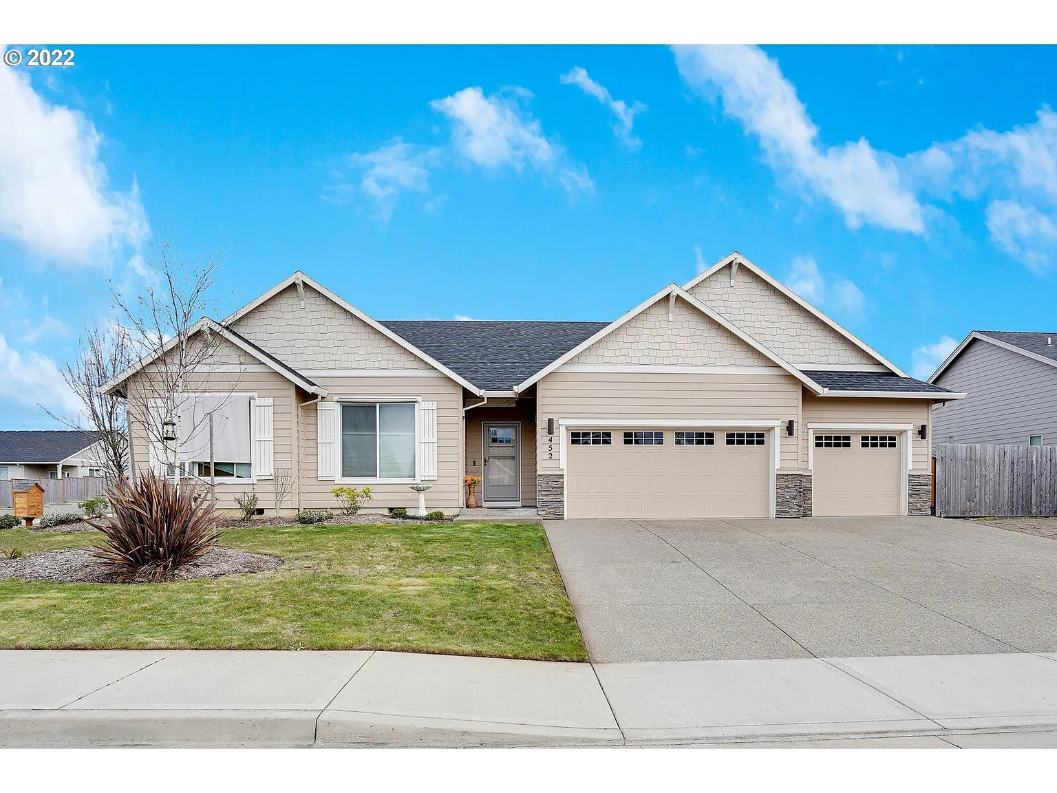 Desirable single level in Sublimity. 2,032± sq ft, 3/2 on 1/4± acre corner lot. Great room floor plan w/9' ceilings & vaults. 3 car garage plus gated, large RV pad and fenced backyard. Sprinkler system front & back. Beautiful kitchen w/custom cabinets & SS appliances included. Primary bath w/tiled shower & soaking tub. Covered patio. Primary bedroom & other bedrooms separated by living space. Gas fireplace.