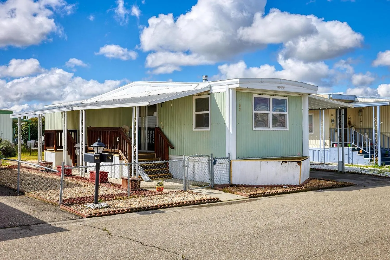 Huge Price Improvement! Almond Blossom 55+ Senior Mobile Home Park has an opportunity waiting for you to enjoy this desirable community that offers a club house & pool. Space #102 is offering a single wide, 2 bedroom, 1 bath with central heat & air (AC was replaced approx. 5 years ago). The bathroom has been updated with a walk in shower stall, sink/vanity & toilet with grab bars. Dual Pane vinyl windows throughout & two exterior doors. The home comes with a washer/dryer stackable unit, refrigerator, storage shed & a chair lift at the front porch for easy entry. There is a carport that can park two smaller vehicles tandem. The lot size offers ample yard space with rock gardens for easy maintenance & plenty of areas to use for a potted garden, sitting out back & soaking up the sun or entertaining friends in your new community. This mobile home is perfectly priced & ready for a new homeowner to add a little elbow grease & make it into the home they desire. Close to shopping, restaurants & a local Gym across the street.