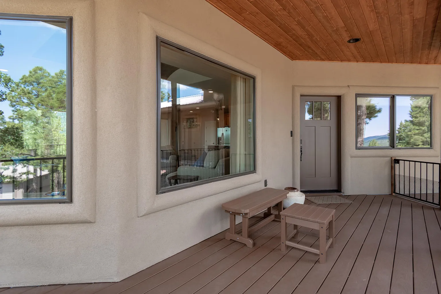 This ONE level, 3bdrm/2 bath contemporary mountain home with views of Grindstone Lake was built in 2018 and only used a few times by current owner. The large windows in living area and Master bedroom provide 180 degree mountain & lake views. Enjoy cool summer evenings on the large covered deck overlooking the lake. Nestled in the tall pines, and located minutes from downtown Ruidoso and Inn of the Mountain Gods. The open floorplan boasts tile floors, stacked rock fireplace & barrel ceiling in the living room. Well appointed kitchen with custom cabinetry, granite counters and quality stainless appliances. The Master bedroom has views of the lake, a nice bathroom and huge closet. The home is being sold mostly furnished with very few exclusions. Tankless water heater, water softener included.