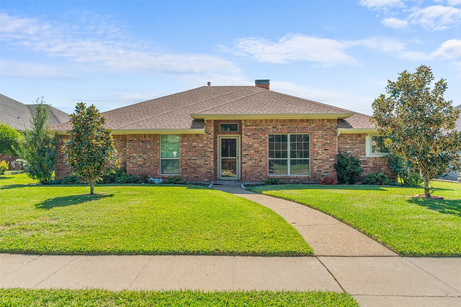 Welcome to 1214 Terrace, a beautiful home located in the highly sought-after Meadowview Farms subdivision in Mesquite! This move-in ready home offers spacious living with fresh paint and new carpet throughout. Featuring 3 bedrooms, 2 bathrooms, and a 2-car garage plus an additional parking pad ideal for an RV or boat. Step into the generous living room with soaring ceilings, a cozy brick fireplace, and abundant natural light perfect for both relaxing and entertaining. The updated kitchen boasts stylish wood flooring, complementing the home’s inviting design. New Window installed in 2021. Water Heater 2023 and HVAC 2017. Outside, you’ll appreciate the curb appeal and well-maintained exterior. With no HOA and a prime location just 2 minutes from major highways and shopping, this home combines convenience, beauty, and value. Don’t miss the chance to make this your new home. Schedule a showing today!