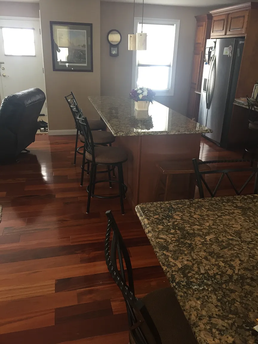 Updated, open floor plan, Euge kitchen with two islands. Granite in the kitchen and both bathrooms, 5 inch tiger wood hardwood floors . Possible fourth bedroom or family room large . To car back garage very large , shed, above ground pool.