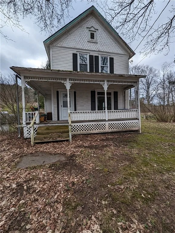 Turn of the Century Traditional home with great potential. This large well built house boasts unique elements from the late 1800s. Beautiful stained glass window in the living room, unique built in in the dining room, covered wrap around porch, large living room, dining room, and master bedroom. Some updates have been started new boiler installed several years ago many replacement windows have been installed as well. Some recessed lighting has been placed in the living room. The property is being sold AS IS due to a known defect with the septic system and that will likely have to be replaced. The bathroom will also need to be renovated. Large almost 2 acre lot in a small town, this house has "good bones" and will make a beautiful home with some work.